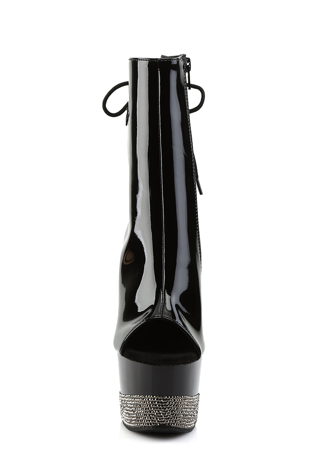 got ’em bowing down to ya! These patent platform booties have peep toe fronts, cutout lace up back, stiletto heels, hidden side zip pockets, and inner zip closures.