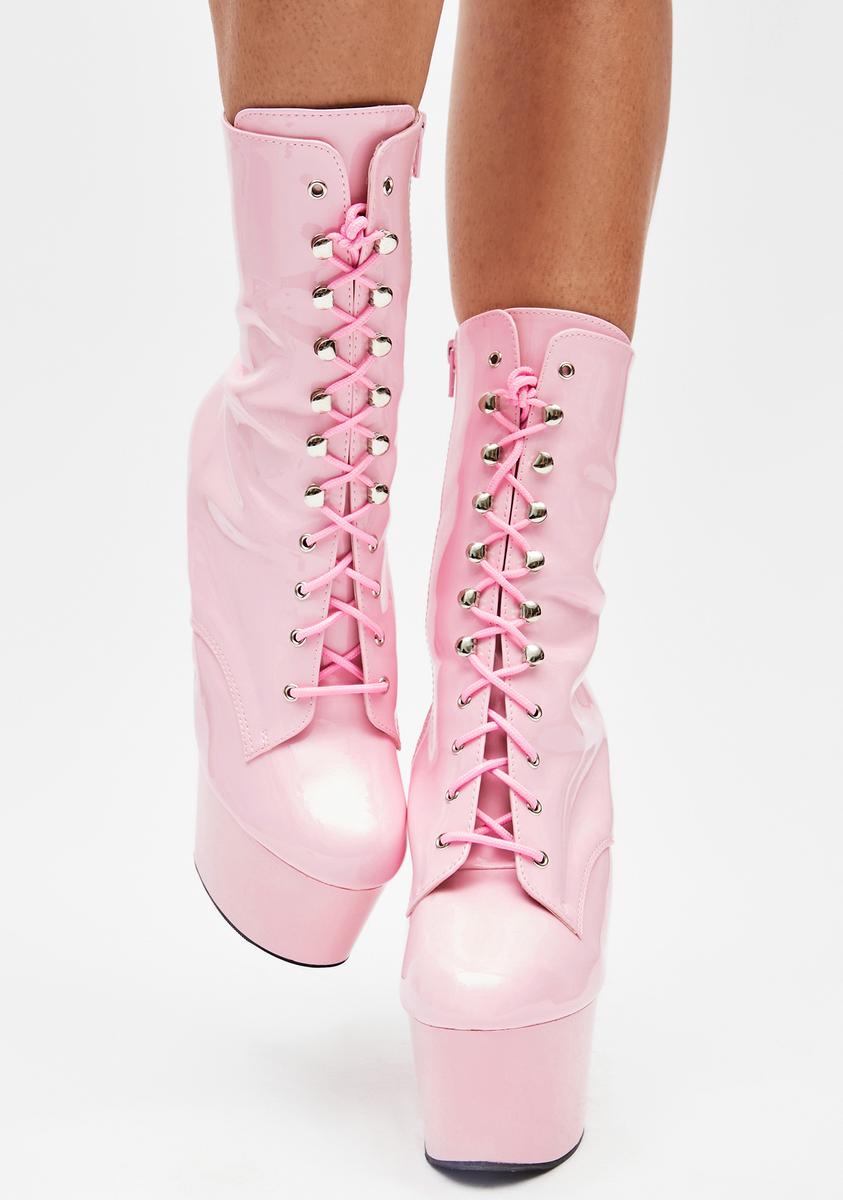 welcome to the player’s club. These platform stiletto boots have a vegan leather construction, adjustable lace-ups, and side zip closures.