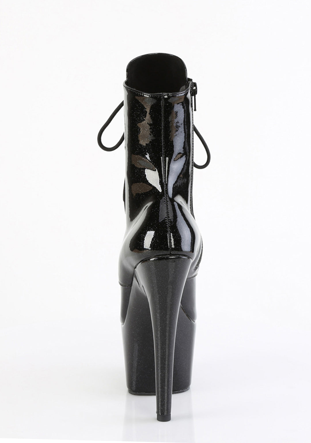 These shoes have a patent vinyl construction, platform soles, stiletto heels, a front lace-up design, and side zipper closures.