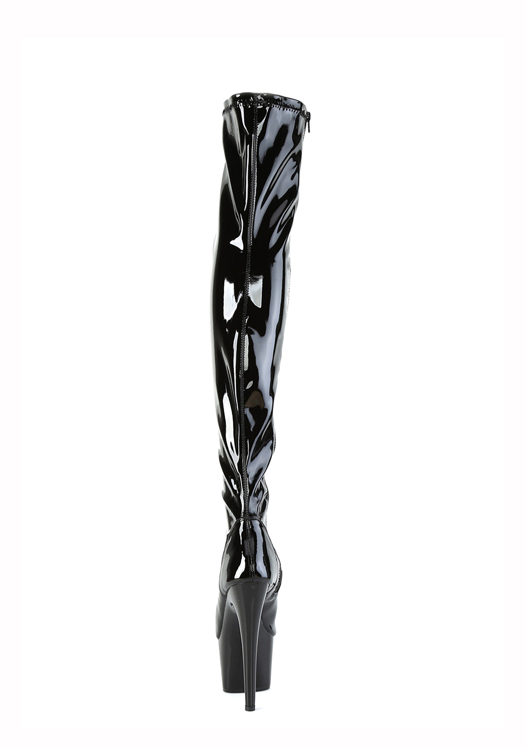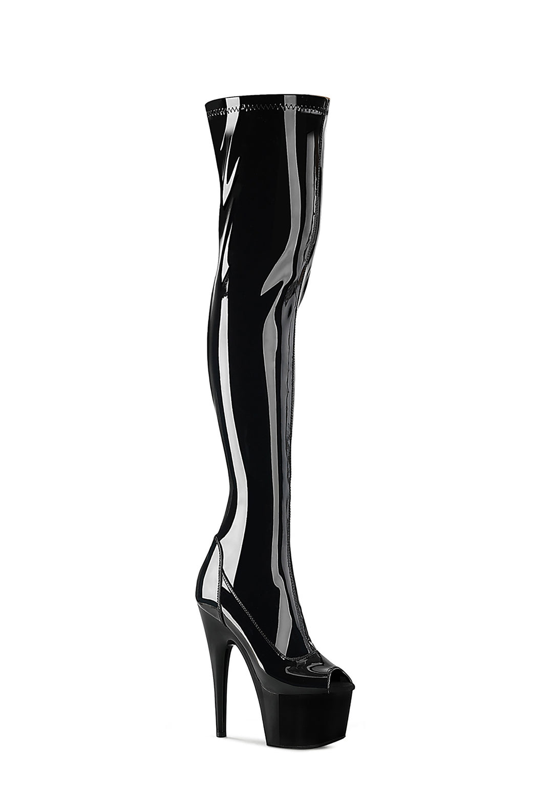 give ’em a late night call. These platform stiletto boots have a patent vegan leather construction, a peep toe design, and side zip closure.