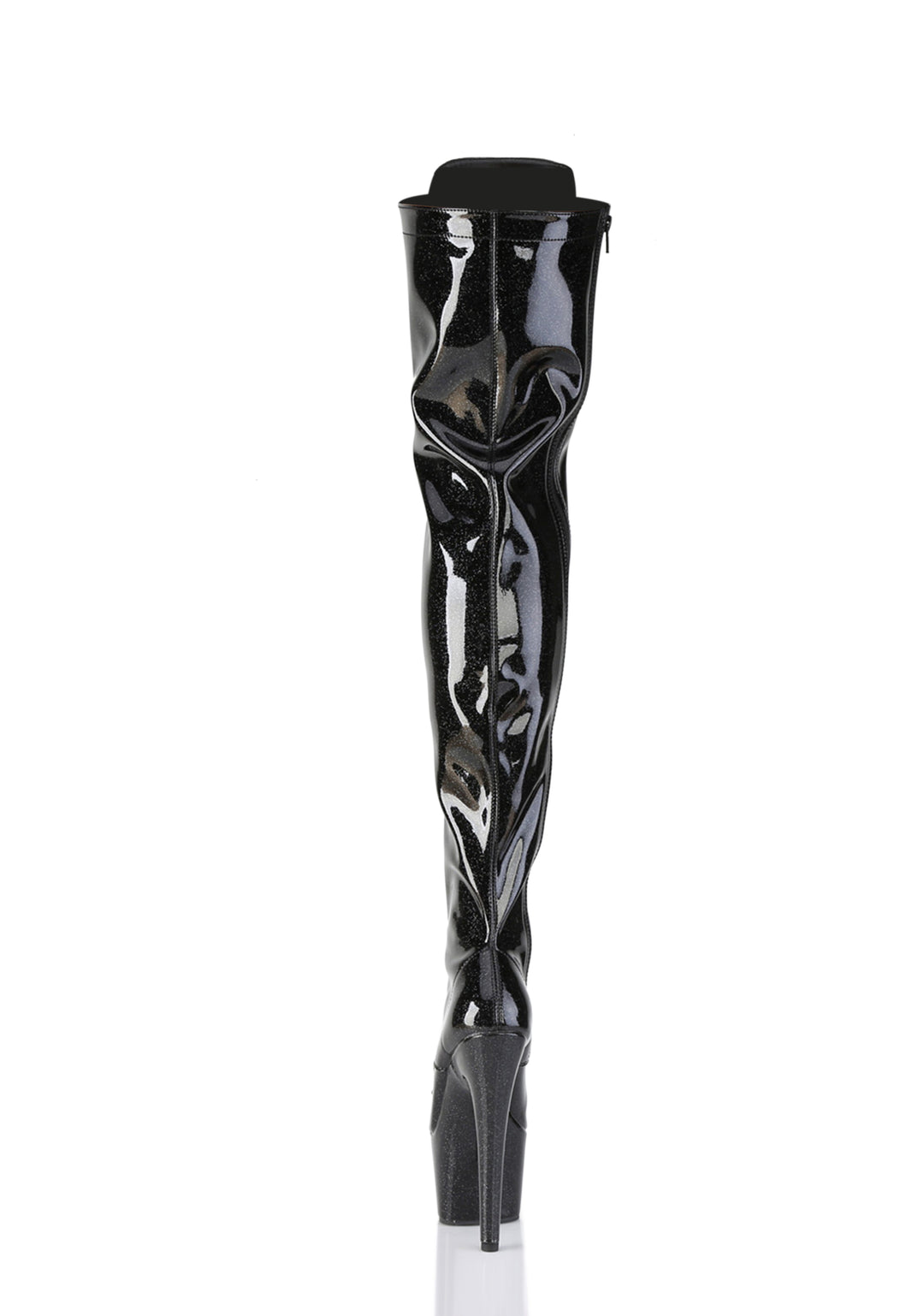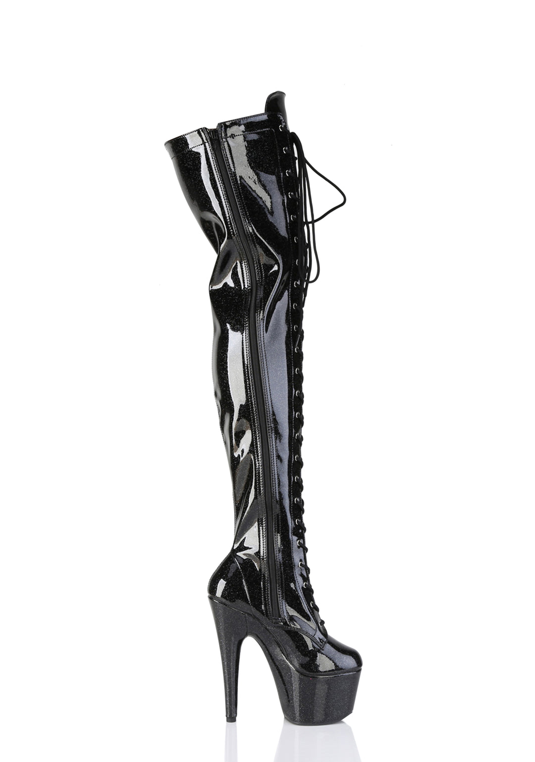 These boots have a vinyl vegan leather construction, a glitter finish, platform soles, stiletto heels, front lace-ups, and side zipper closures.