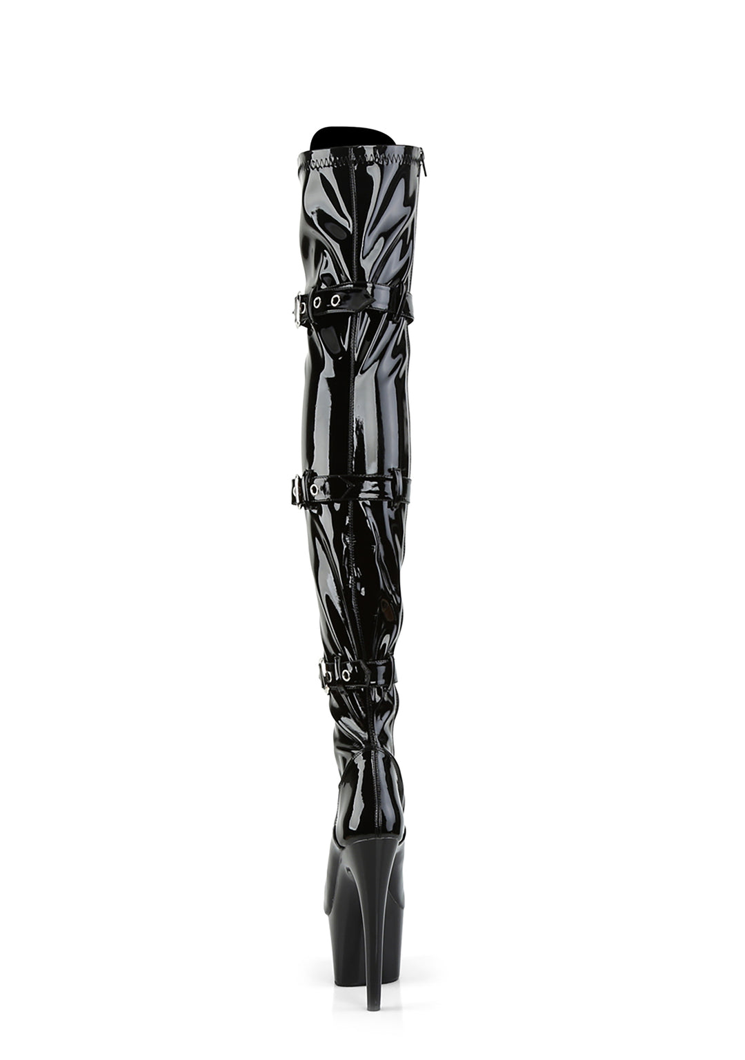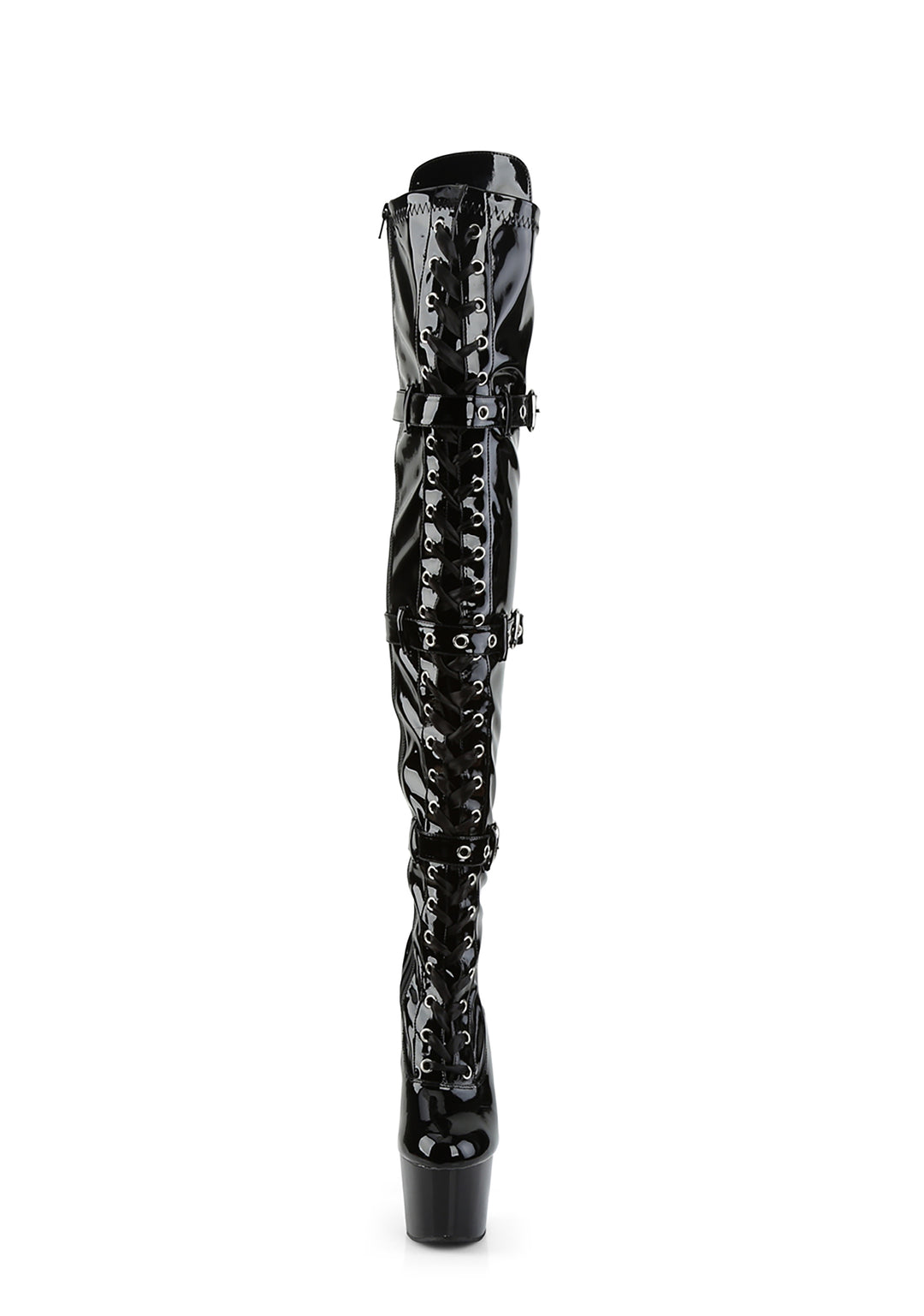 These boots have a vinyl construction, front lace-ups, platform soles, stiletto heels, buckle strap details, and side zipper closures.