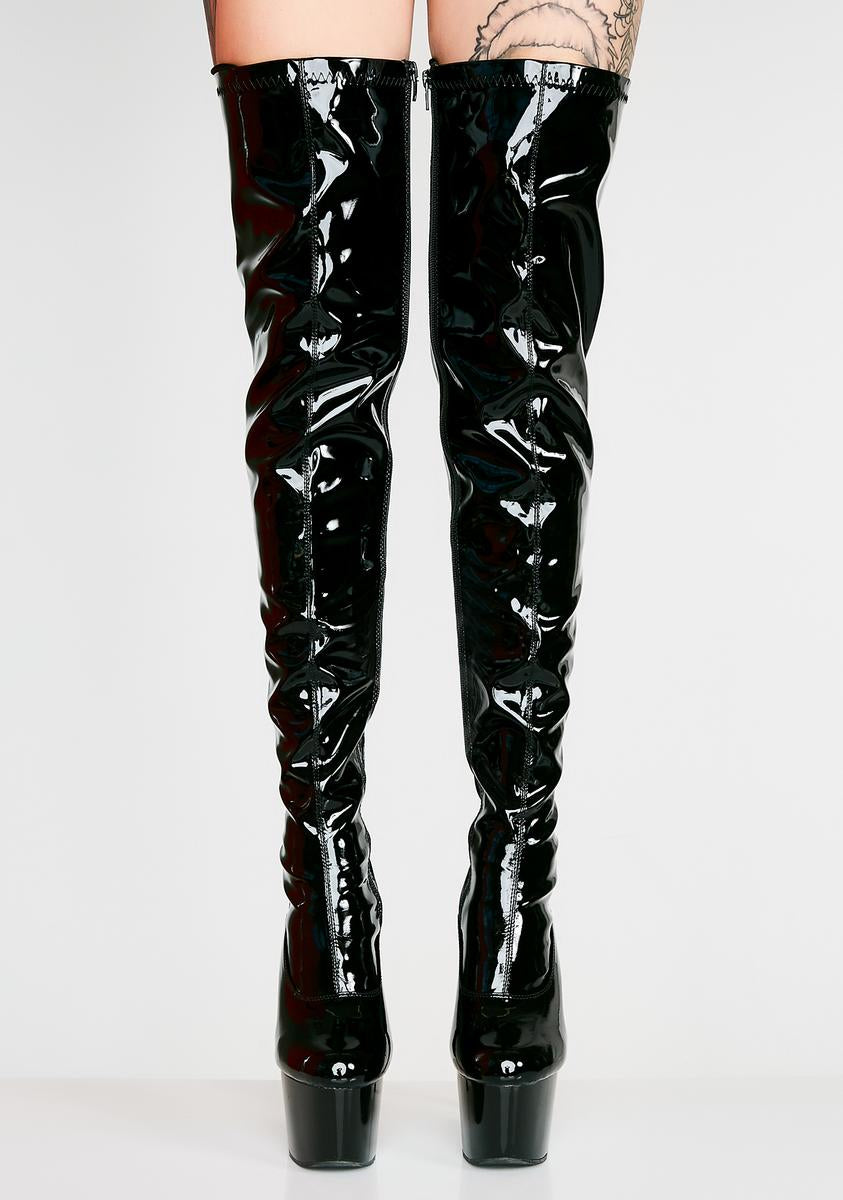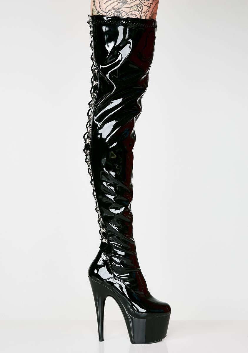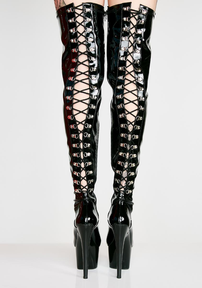 cuz shake ya booty meat. Get low in these vegan leather thigh-high boots that have a supa slick detail, and a back lace-up closure to have ’em askin’ for a private dance.
