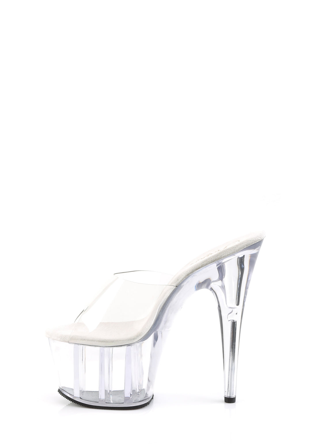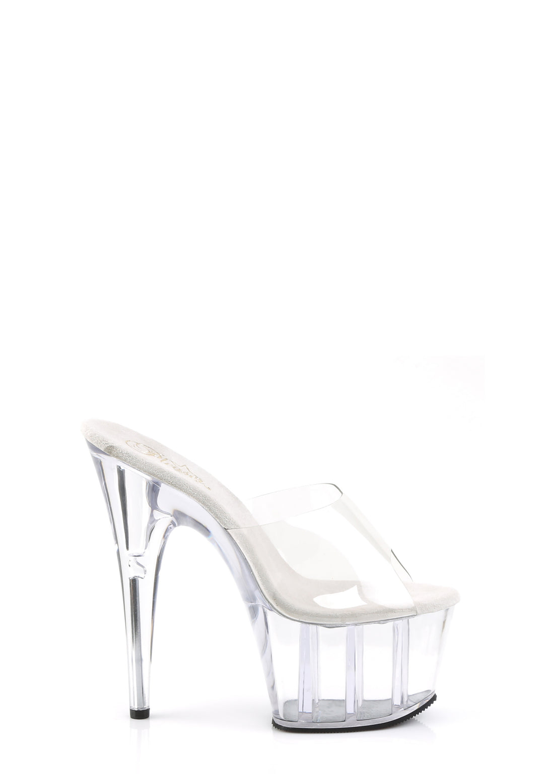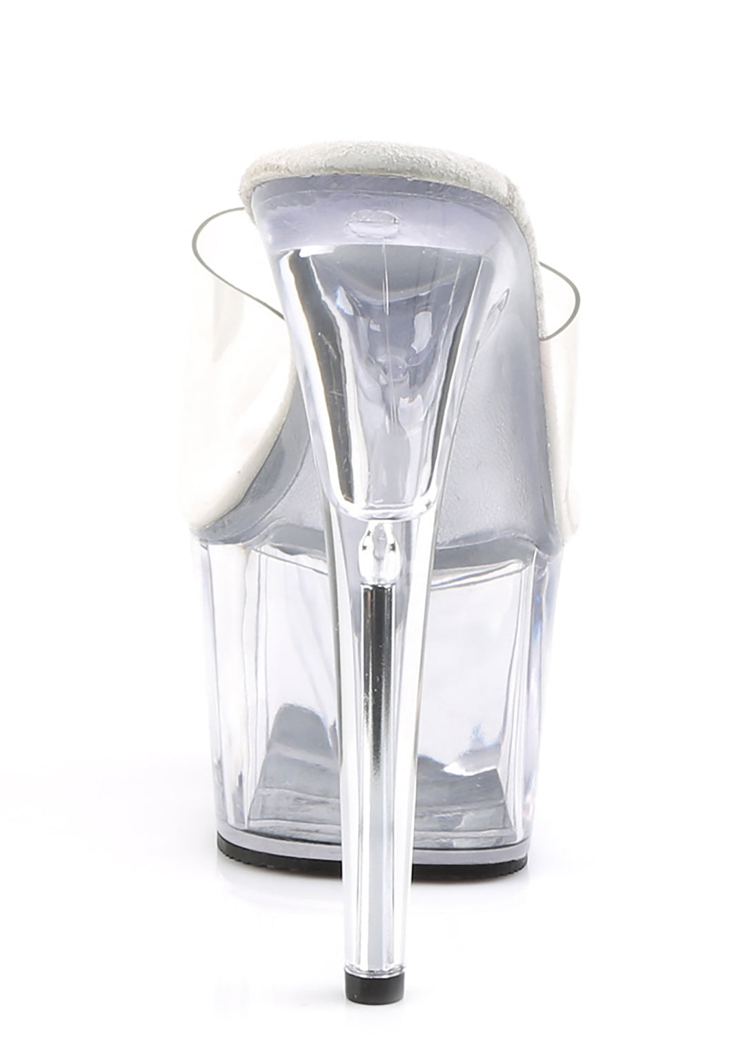 These slides have clear vinyl uppers, a peep toe design, clear platform soles, clear stiletto heels, and a slip on fit.