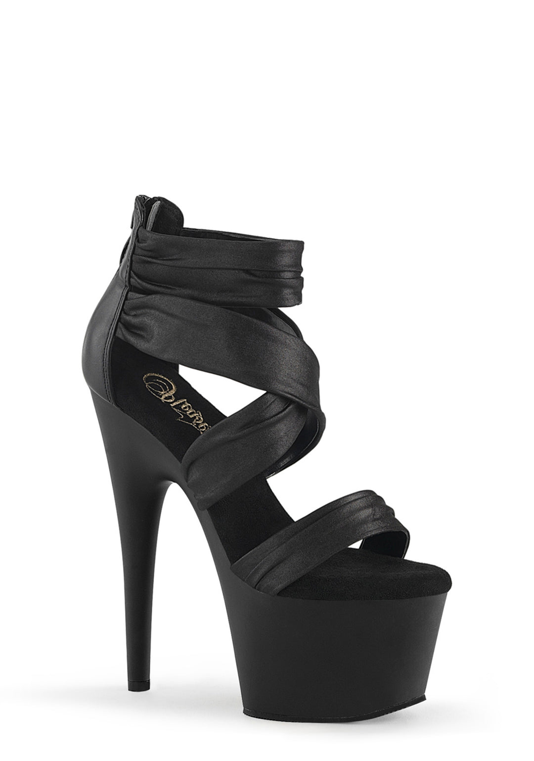 These shoes have a vegan leather wrap design, platform soles, stiletto heels, and back zipper closures.