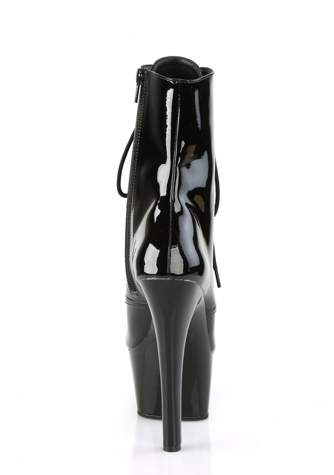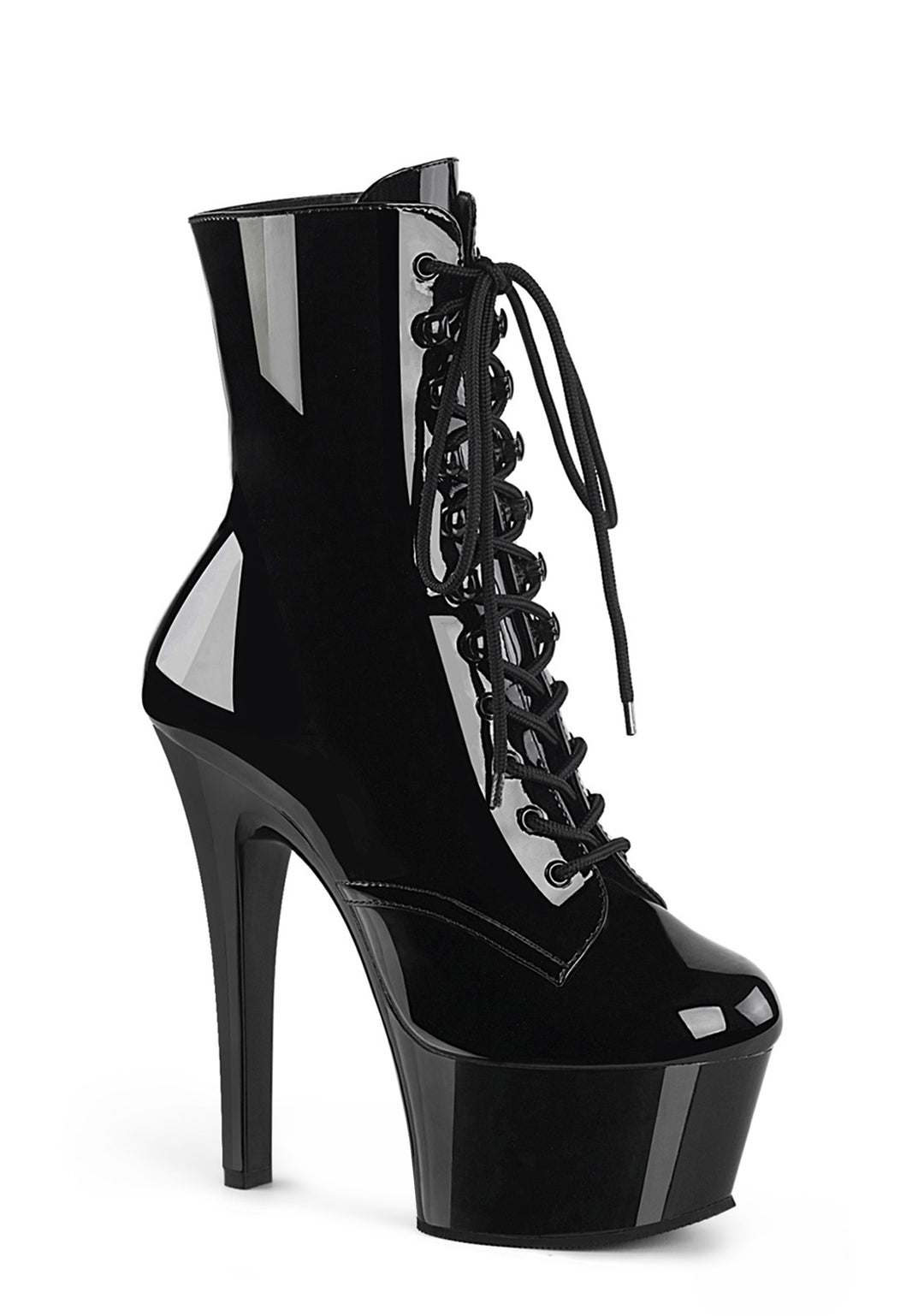 These ankle boots have a vinyl construction, platform soles, stiletto heels, front lace-ups, and side zipper closures.