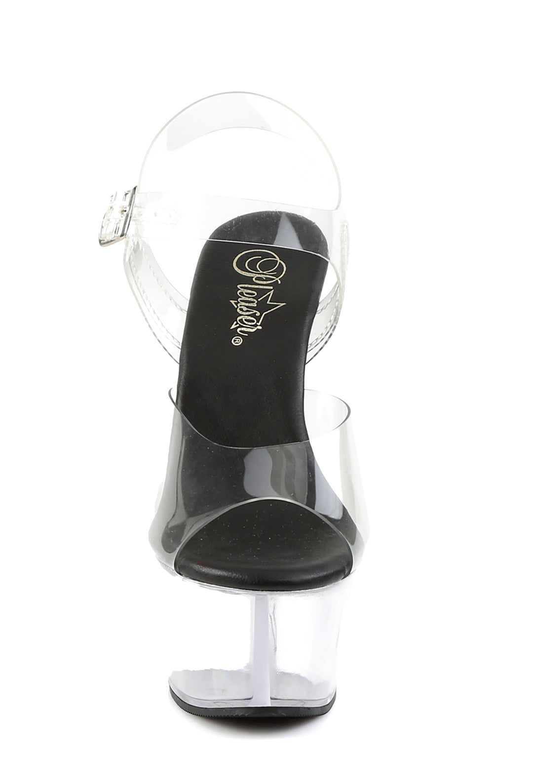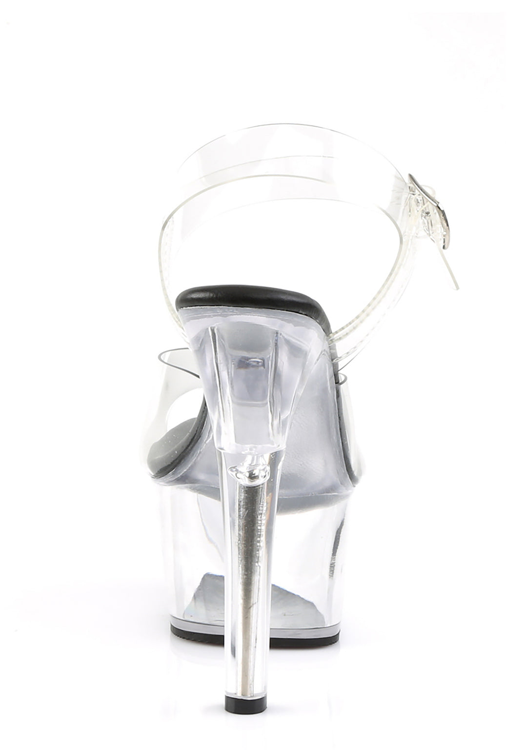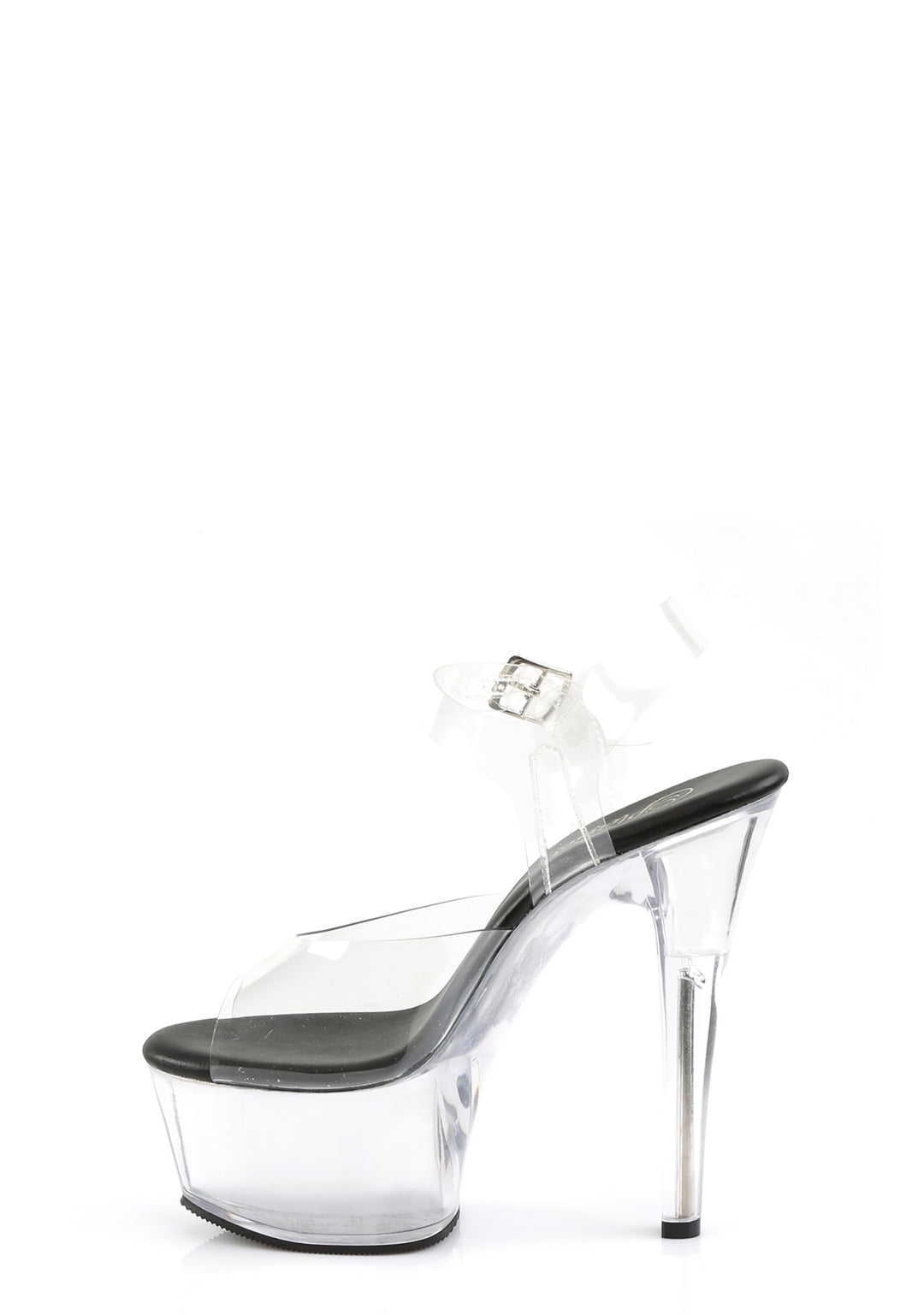 These shoes have clear vinyl uppers, a peep toe design, platform soles, stiletto heels, and adjustable ankle buckle closures.