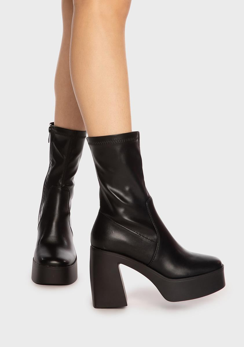 cuz you’re goin’ for that minimalist look. These sock-style platform boots have a stretchy vegan leather construction, mid-calf shafts, square almond toes, side zip closures, and block heels.