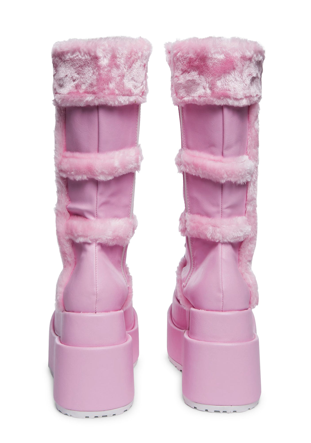 will let you stomp out the rage! These platform boots have a vegan leather construction, faux fur trim, adjustable front lace-up ties, and side zip closures.