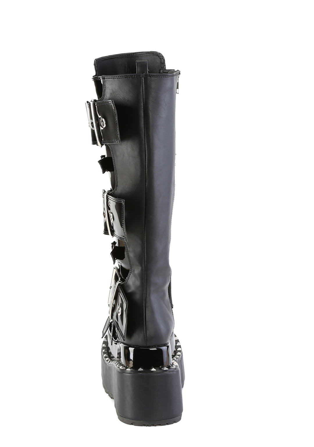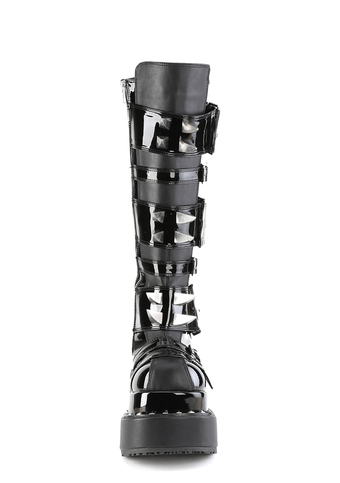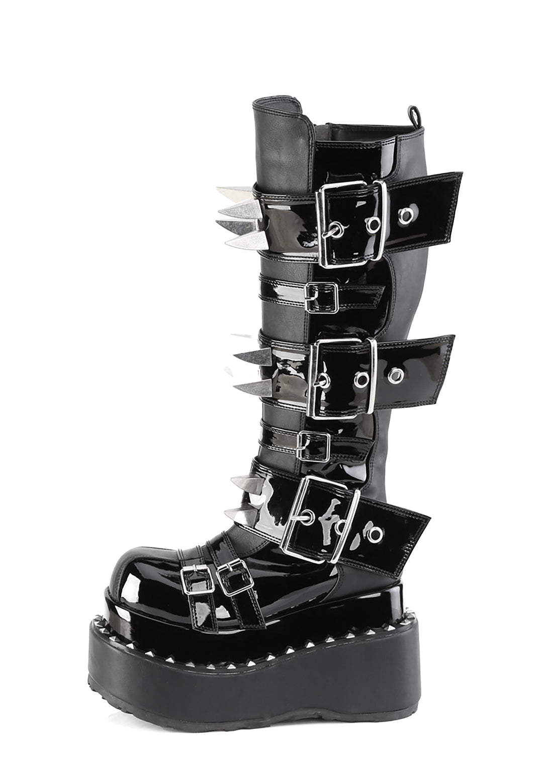 These boots have a patent vinyl construction, multiple buckle strap closures with spiked details on the front, platform soles, pyramid studs, and side zipper closures.
