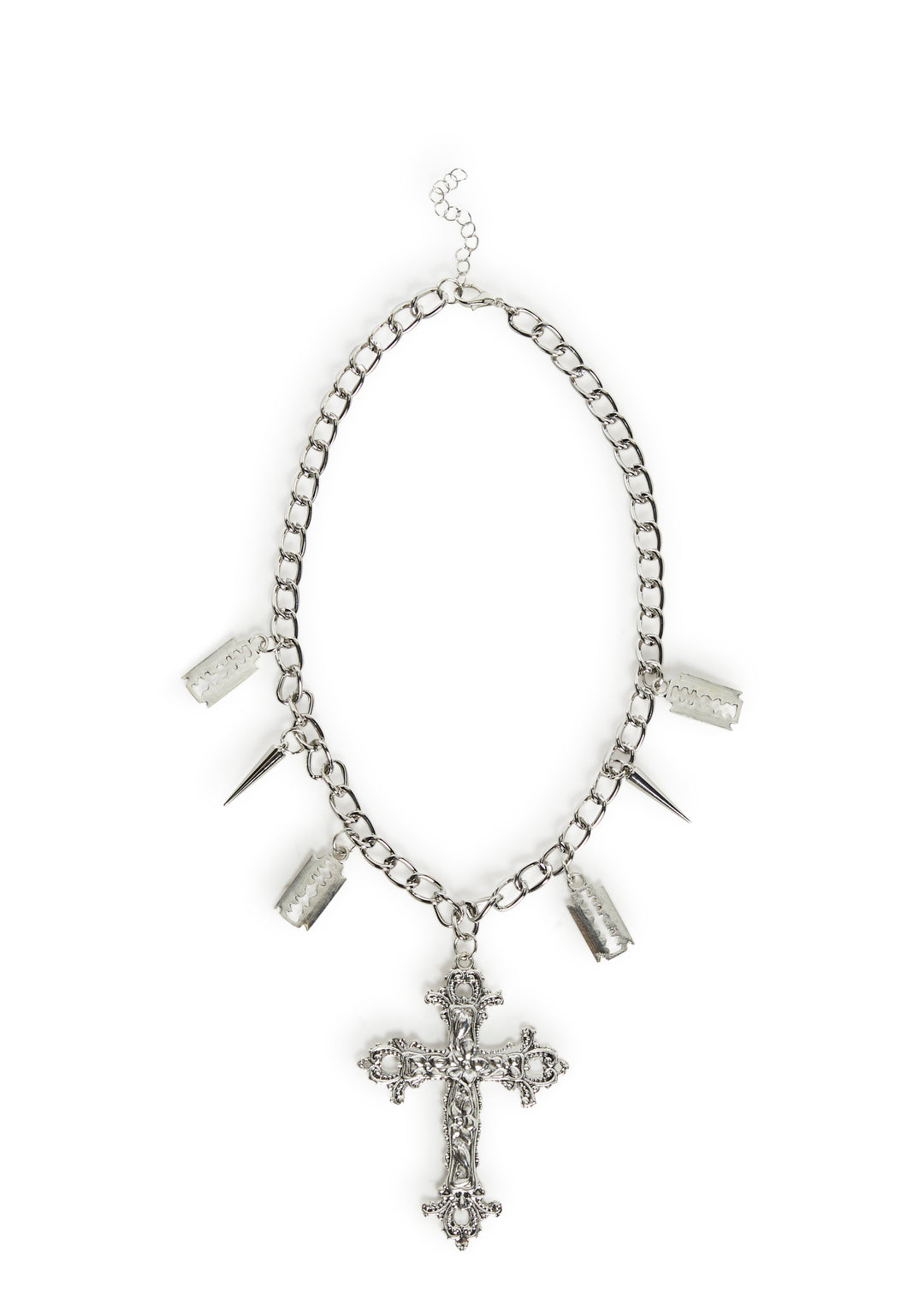 This necklae has a chainlink construction, razorblade charms, and a bedazzled cross in the center.