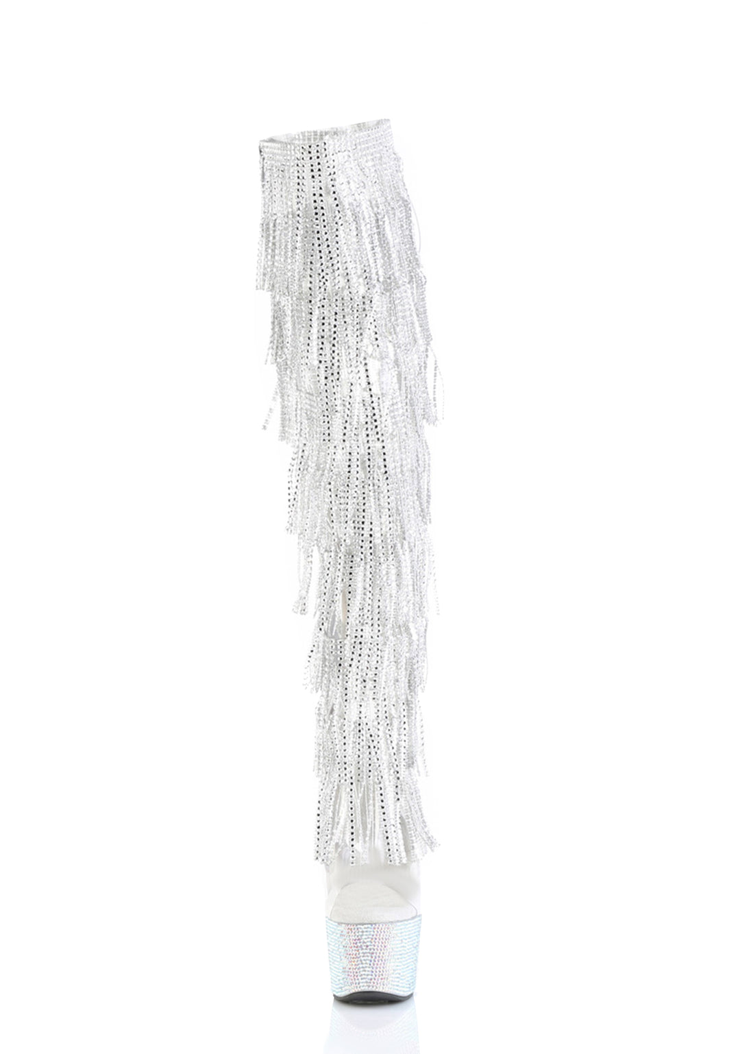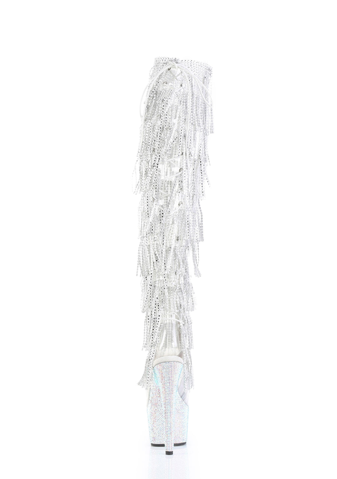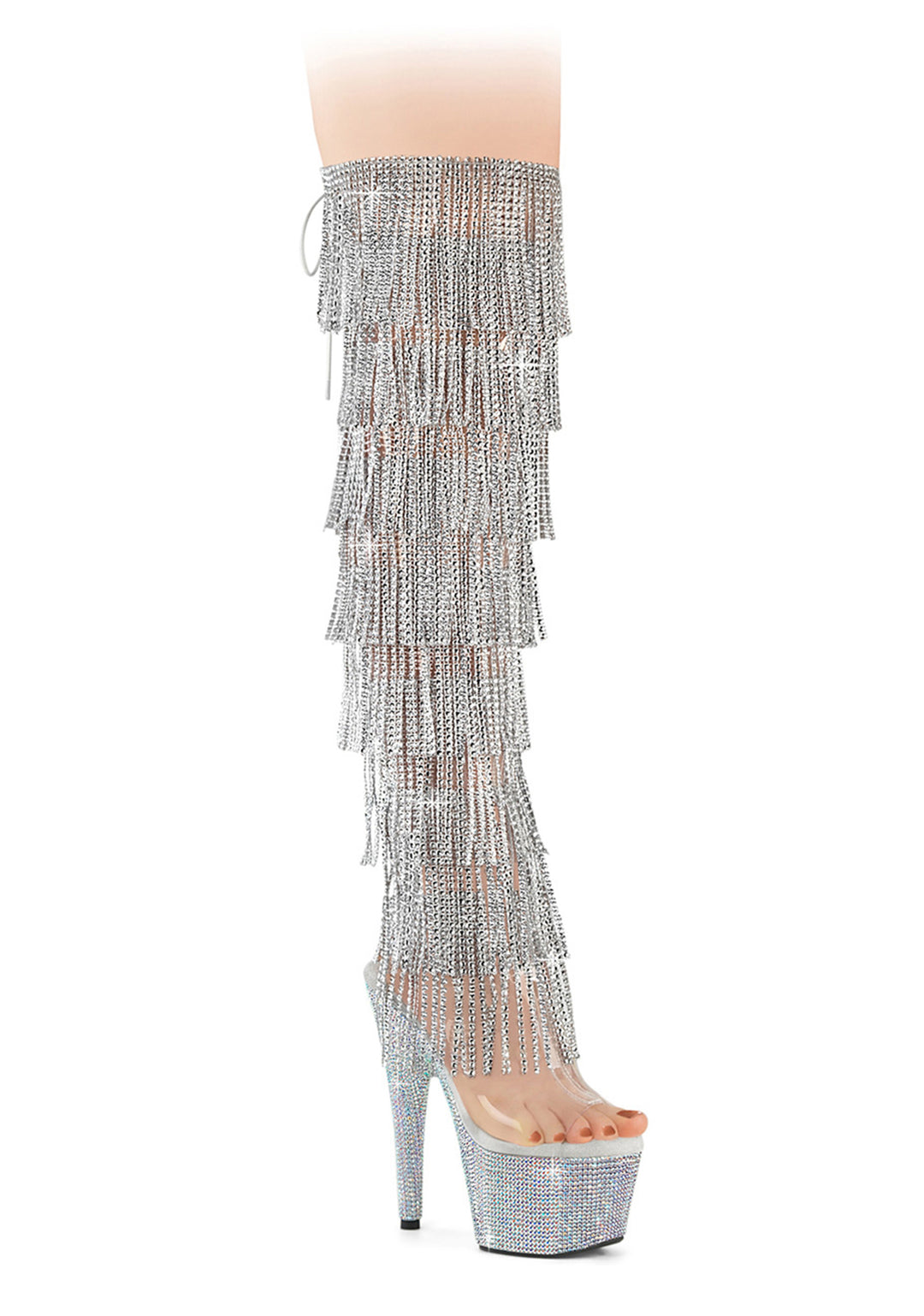 These boots have a 8 layer rhinestone fringe, celar vinyl uppers, rhinestone encrusted platform soles and stiletto heels, and back tie closures.