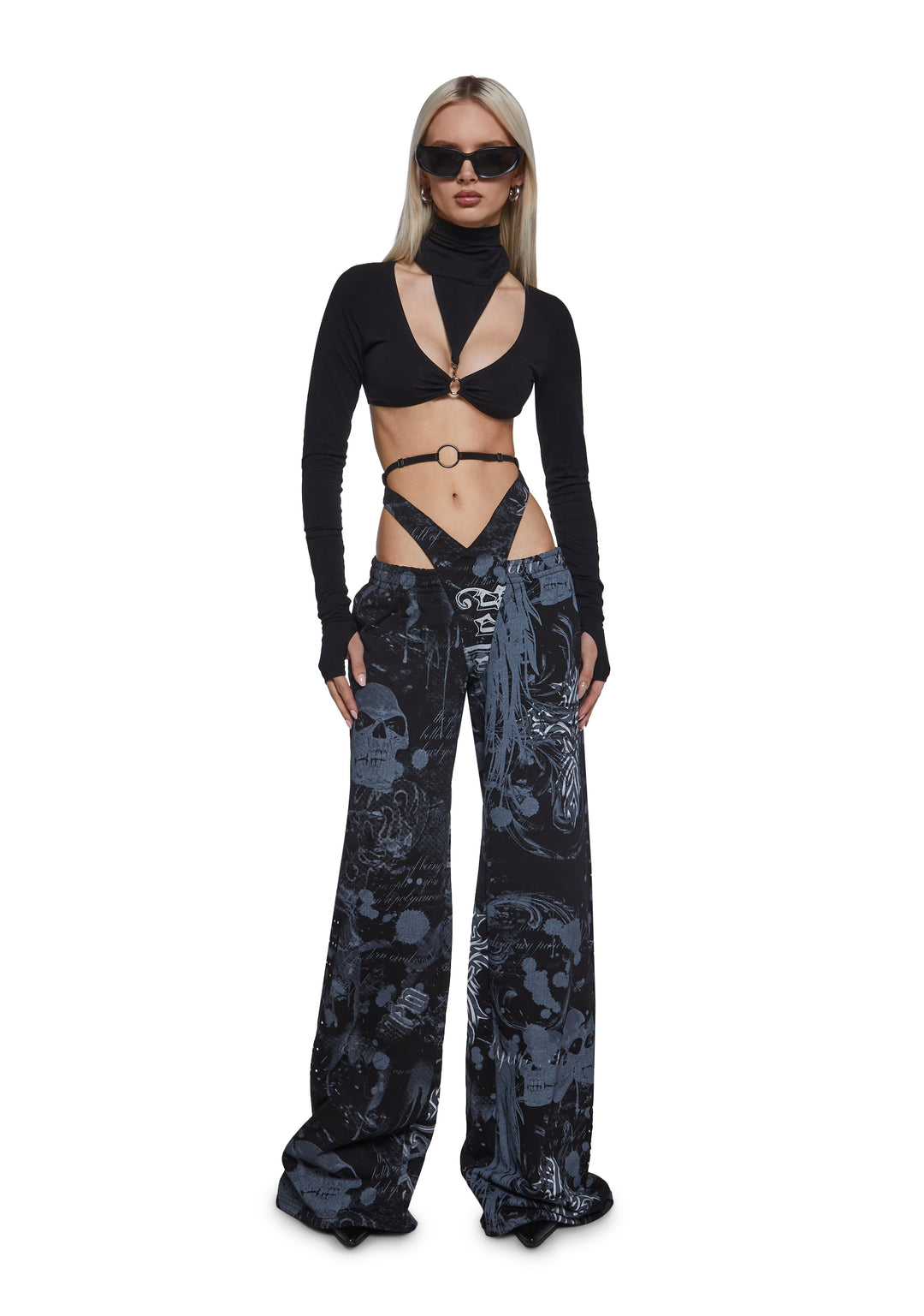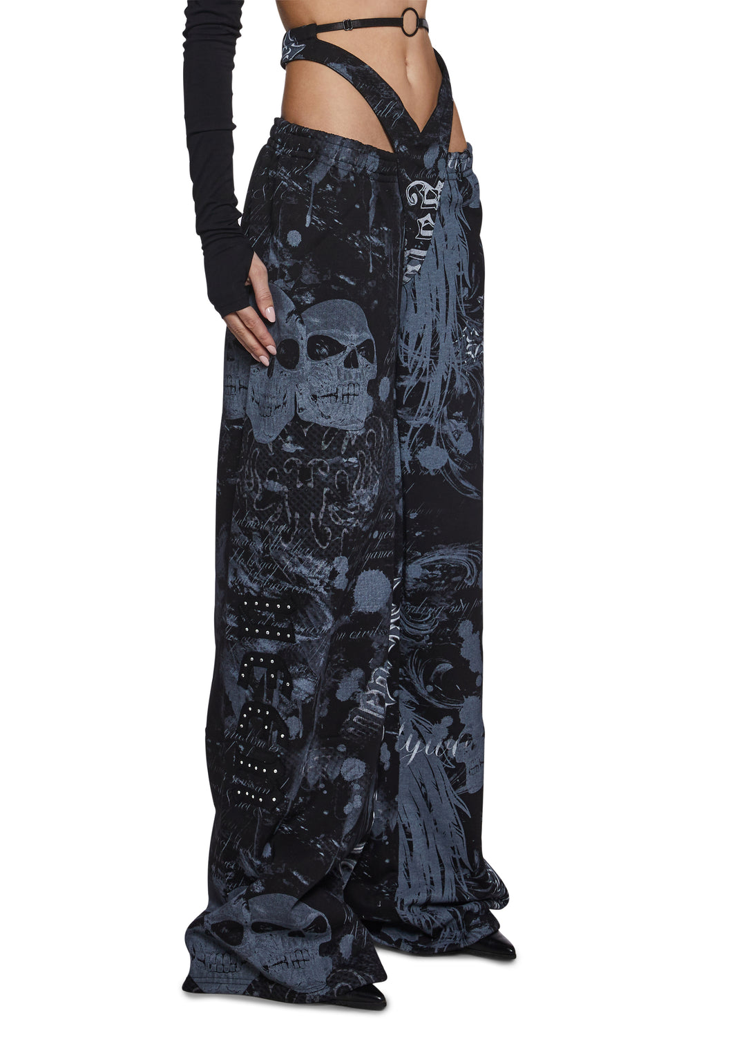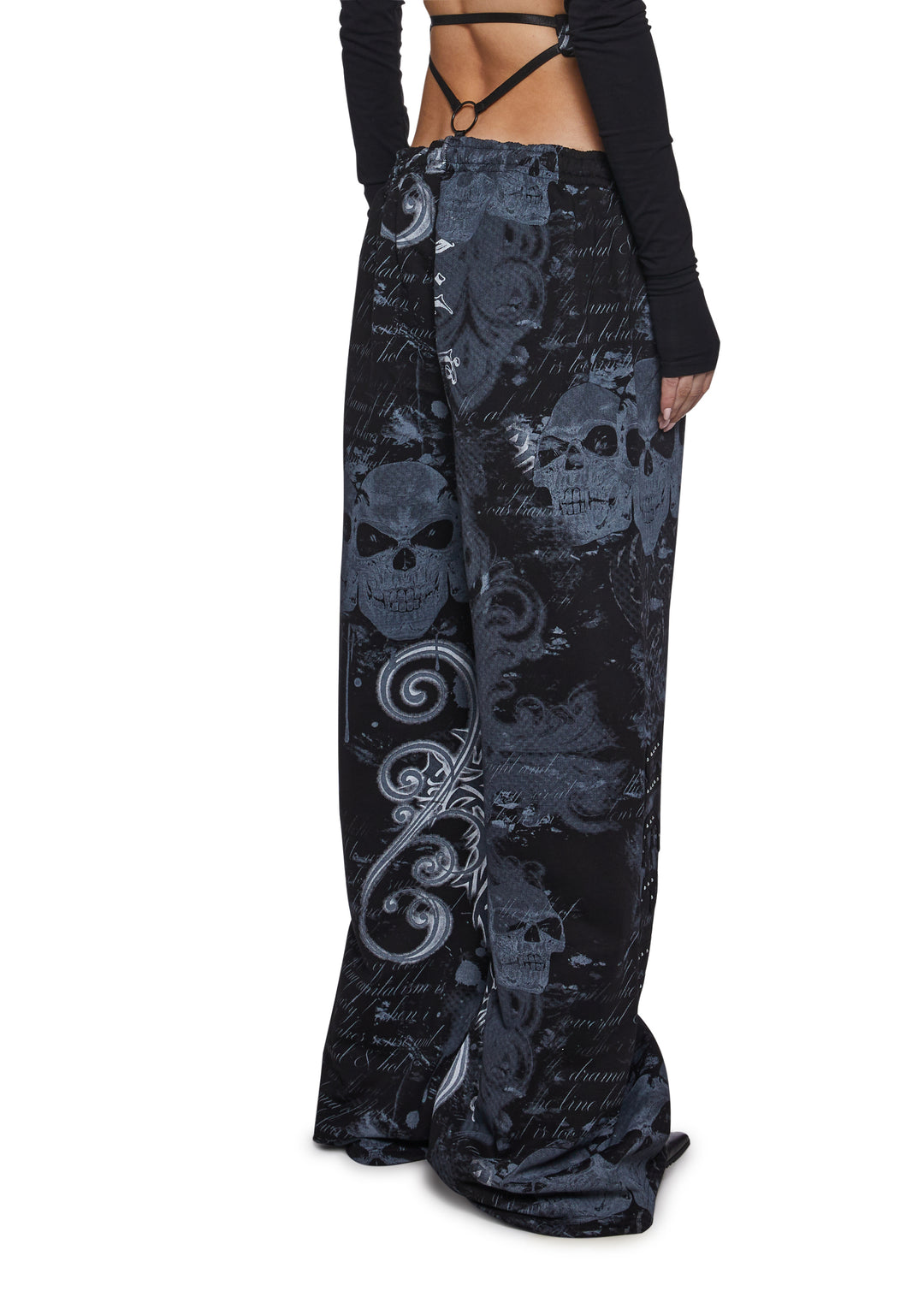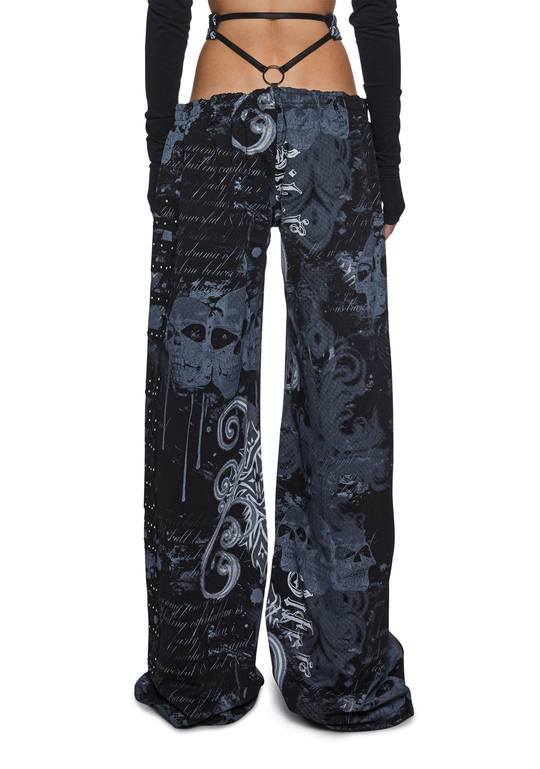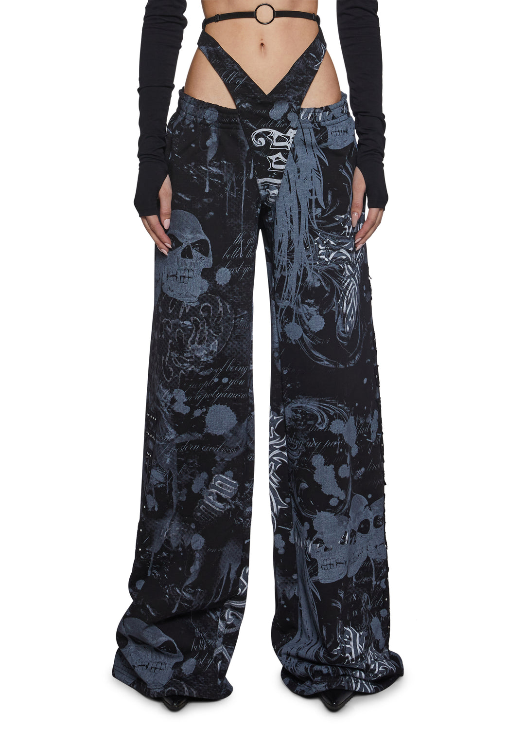 Make a bold statement with these edgy, printed sweatpants featuring a daring g-string detail and a wide-leg fit. The graphic print, featuring skulls and text in bold tones, adds an urban-chic vibe, perfect for creating a standout, street-style look.