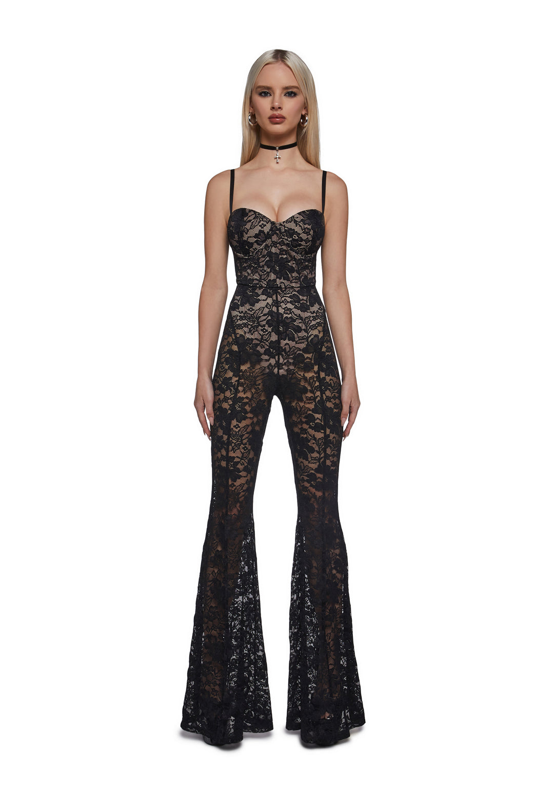 Turn up the allure with this lace halter bodysuit featuring a plunging neckline, sheer floral detailing, and a sculpted silhouette that enhances every curve. Its delicate straps and flared lace legs add a dramatic, high-fashion edge.