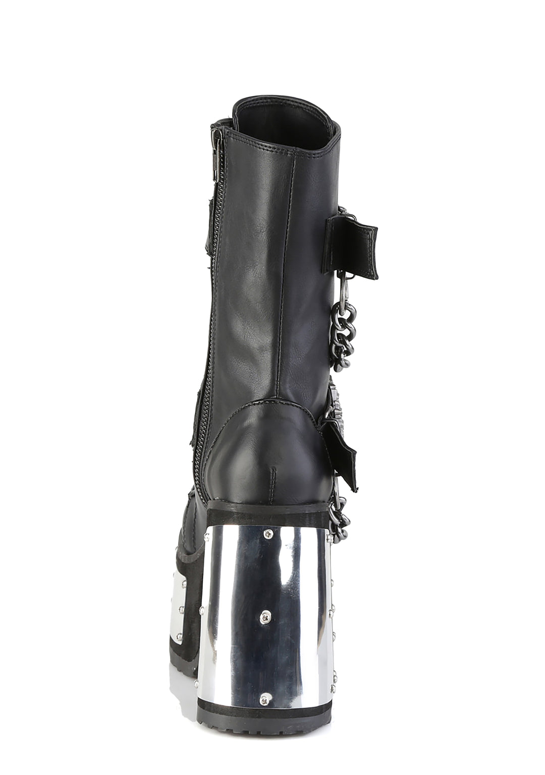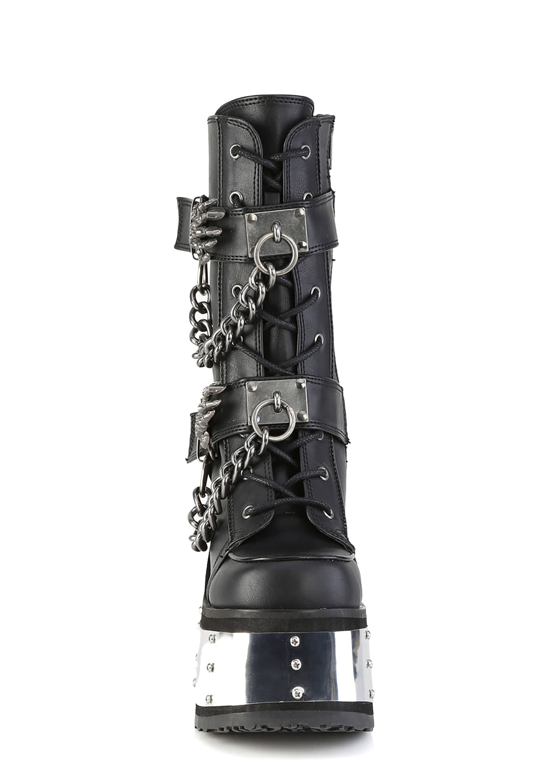 These boots have a vegan leather construction, metal panel wrapped platform soles and heels, double metal skeleton hand buckle straps with attached chains, O-ring hardware, front lace-ups, and side zipper closures.