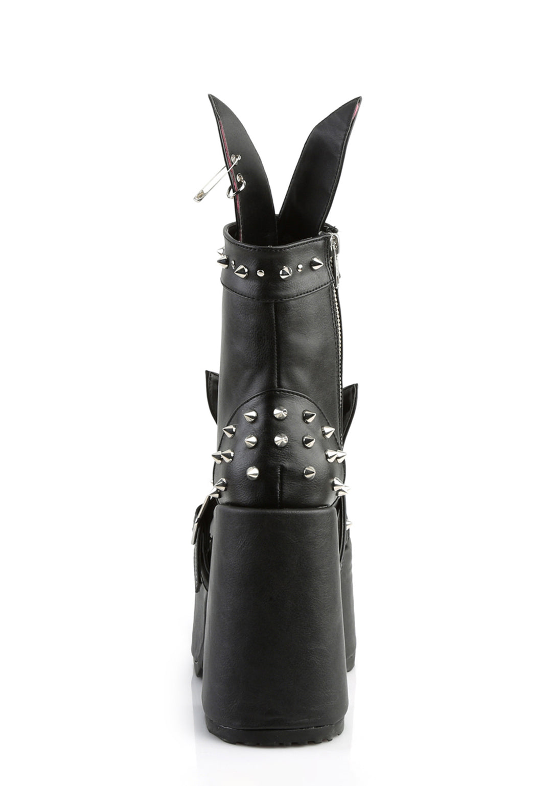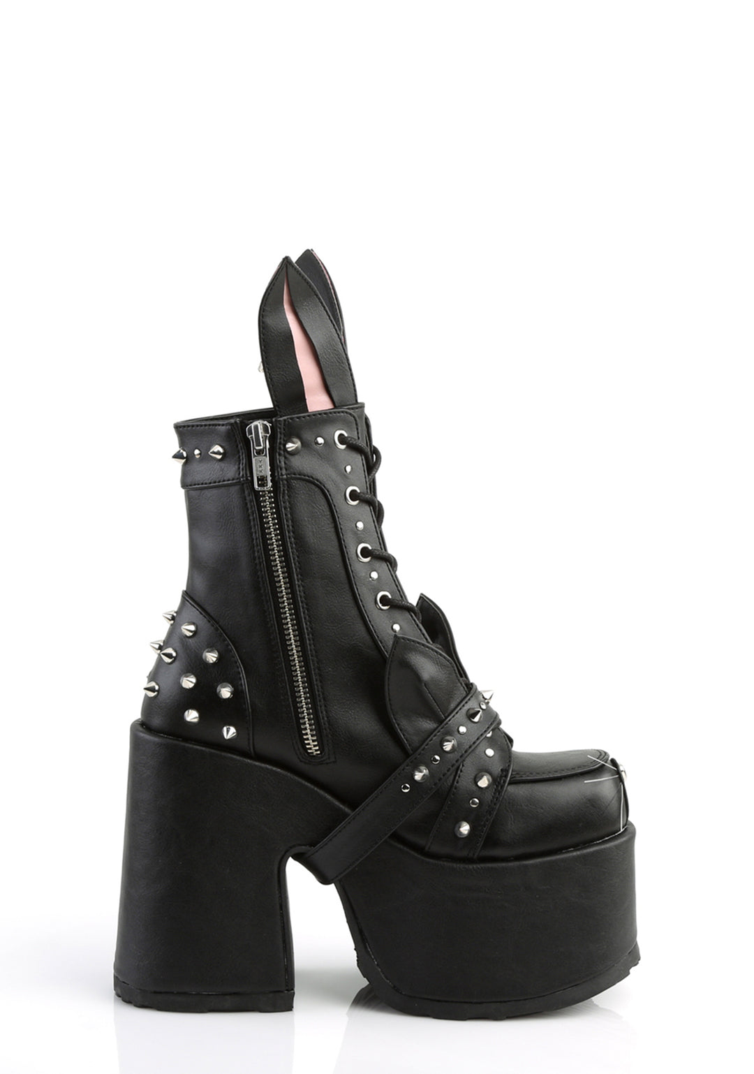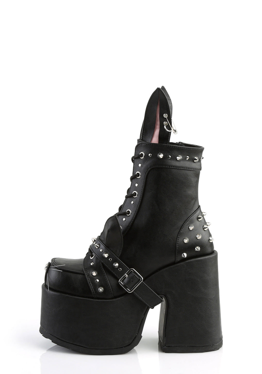 Boots have a vegan leather construction, stud detailing, front lace-ups, and side zips.