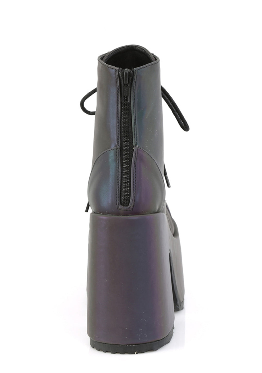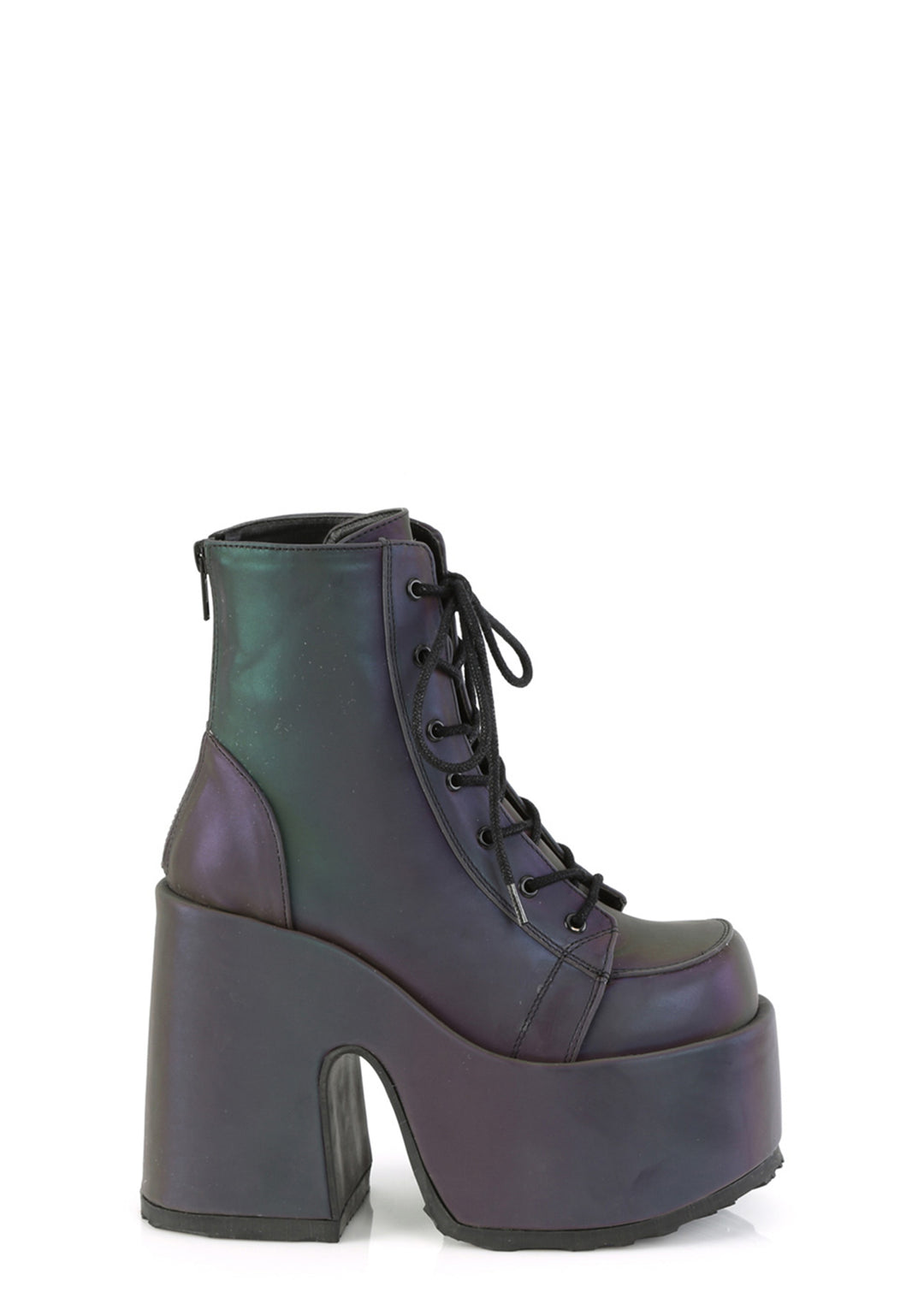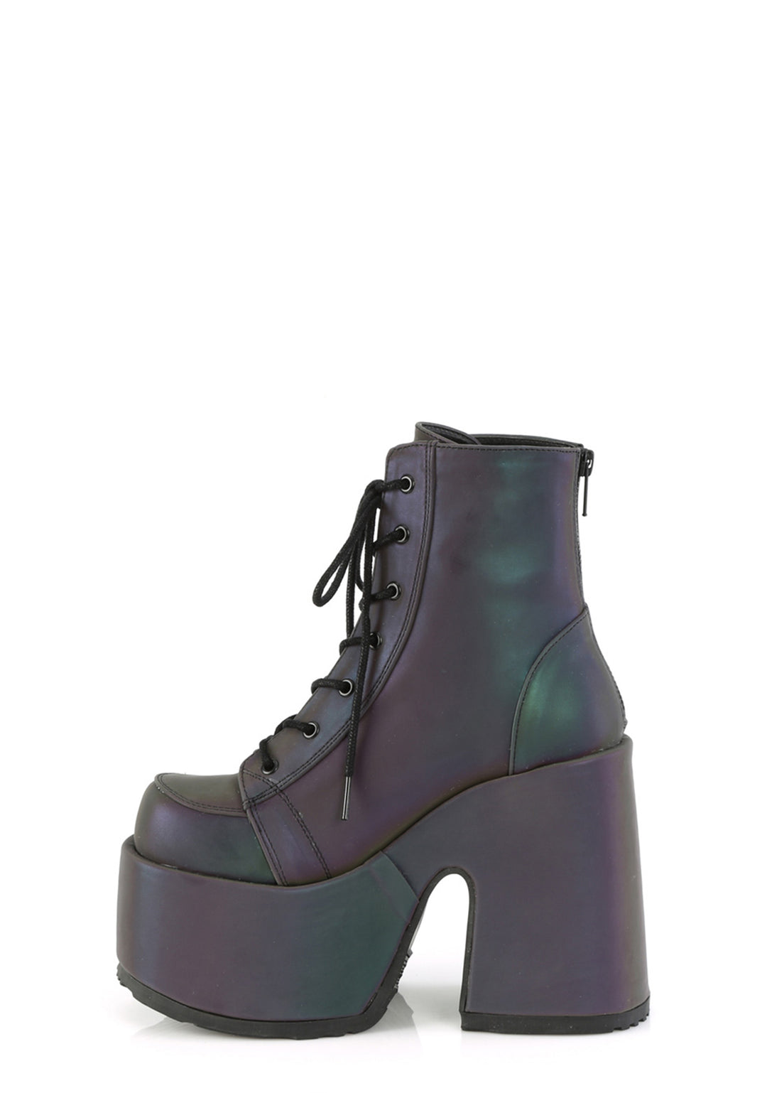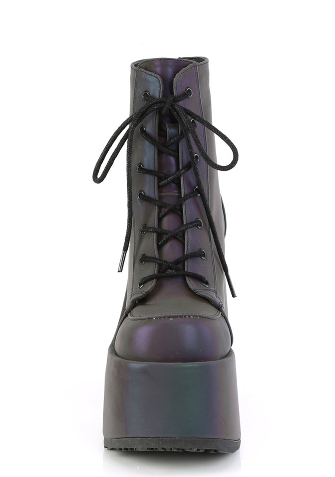 should we curtsy? These green reflective boots have ultra thick platform soles and heels, adjustable laces, and back zip closures.