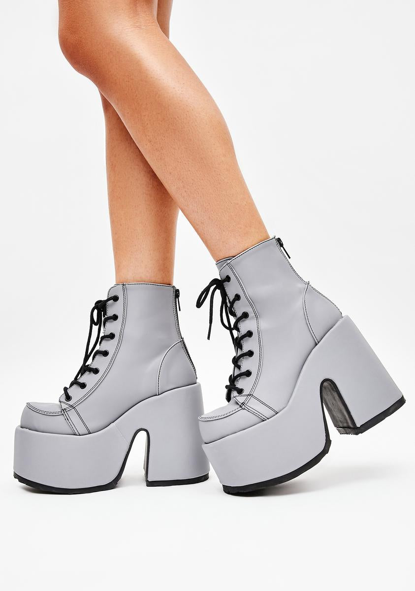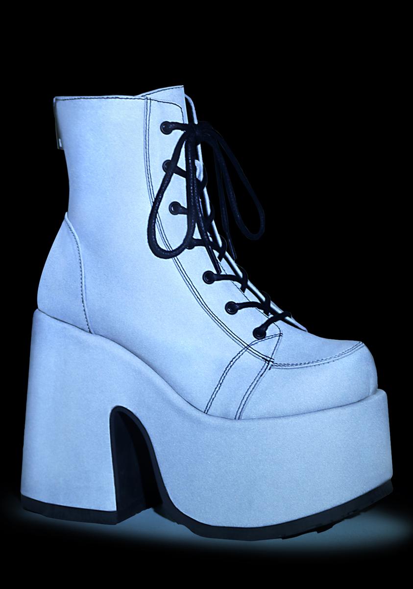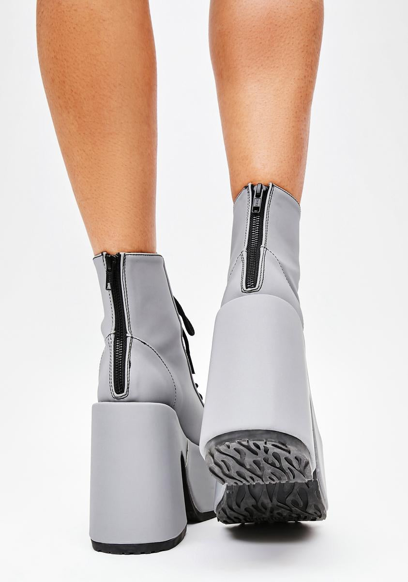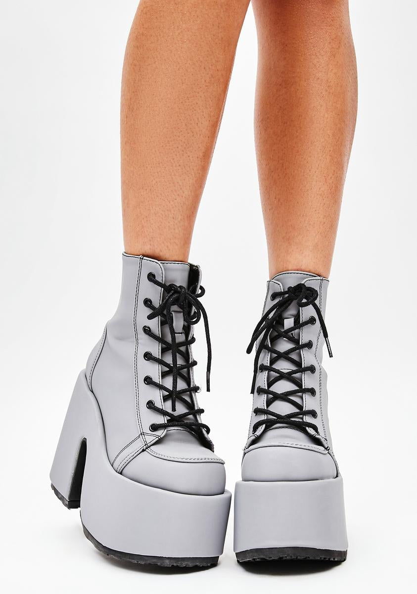 should we curtsy? These silver reflective boots have ultra thick platform soles and heels, adjustable laces, and back zip closures.