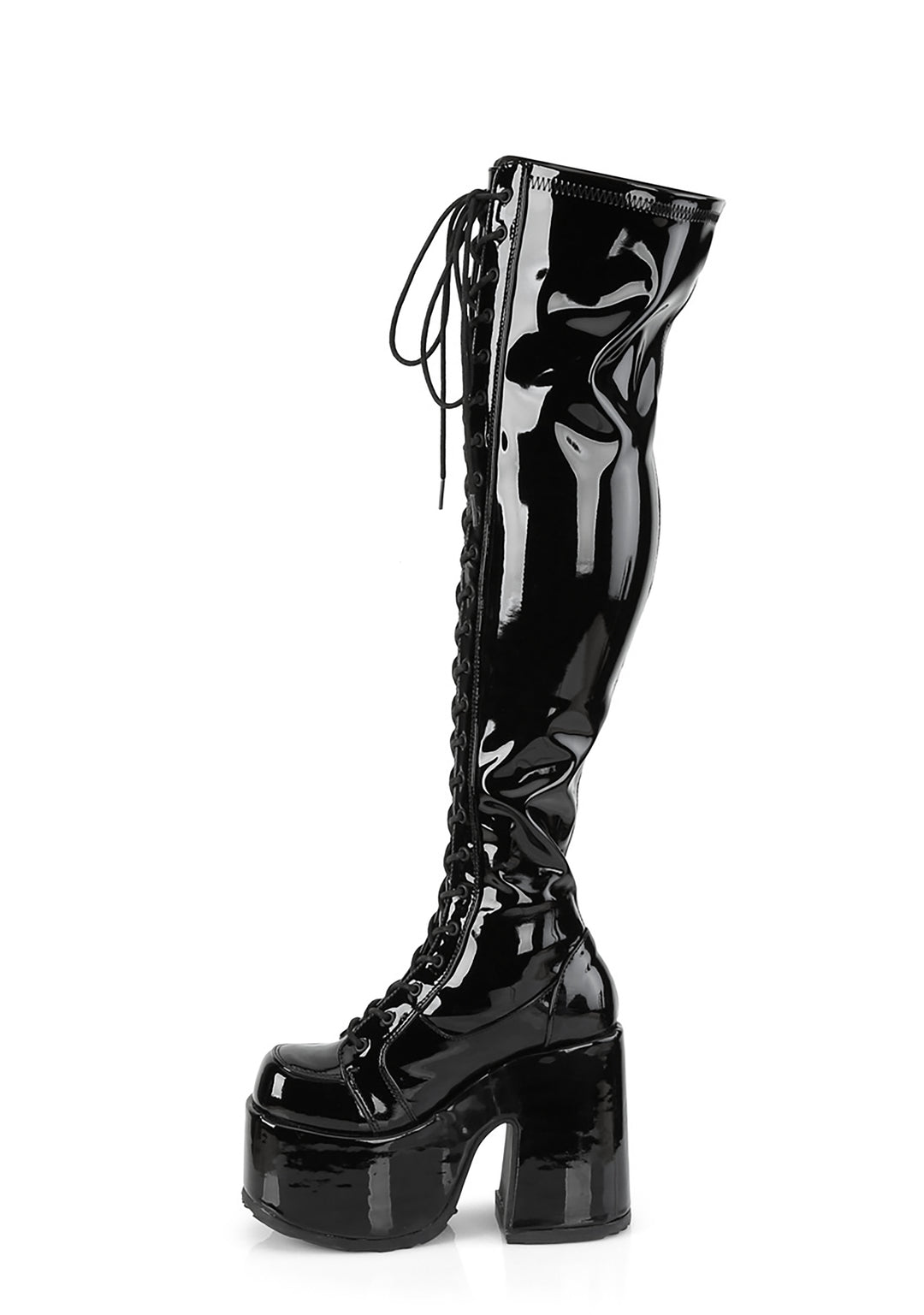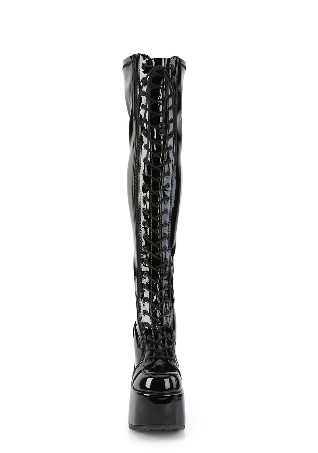 should we curtsy? These sexxxy thigh high boots have a patent stretch vegan leather construction, platform soles with chunky heels, adjustable lace-ups, and side zip closures.