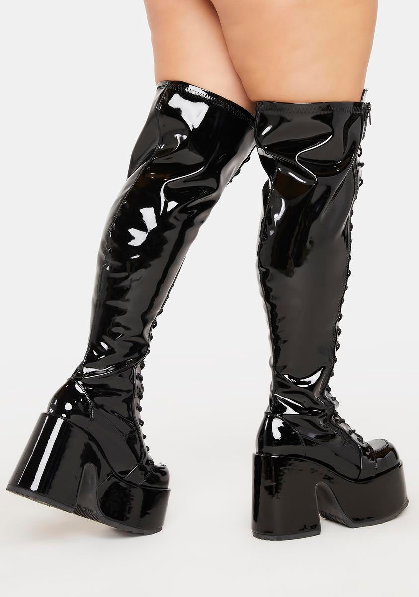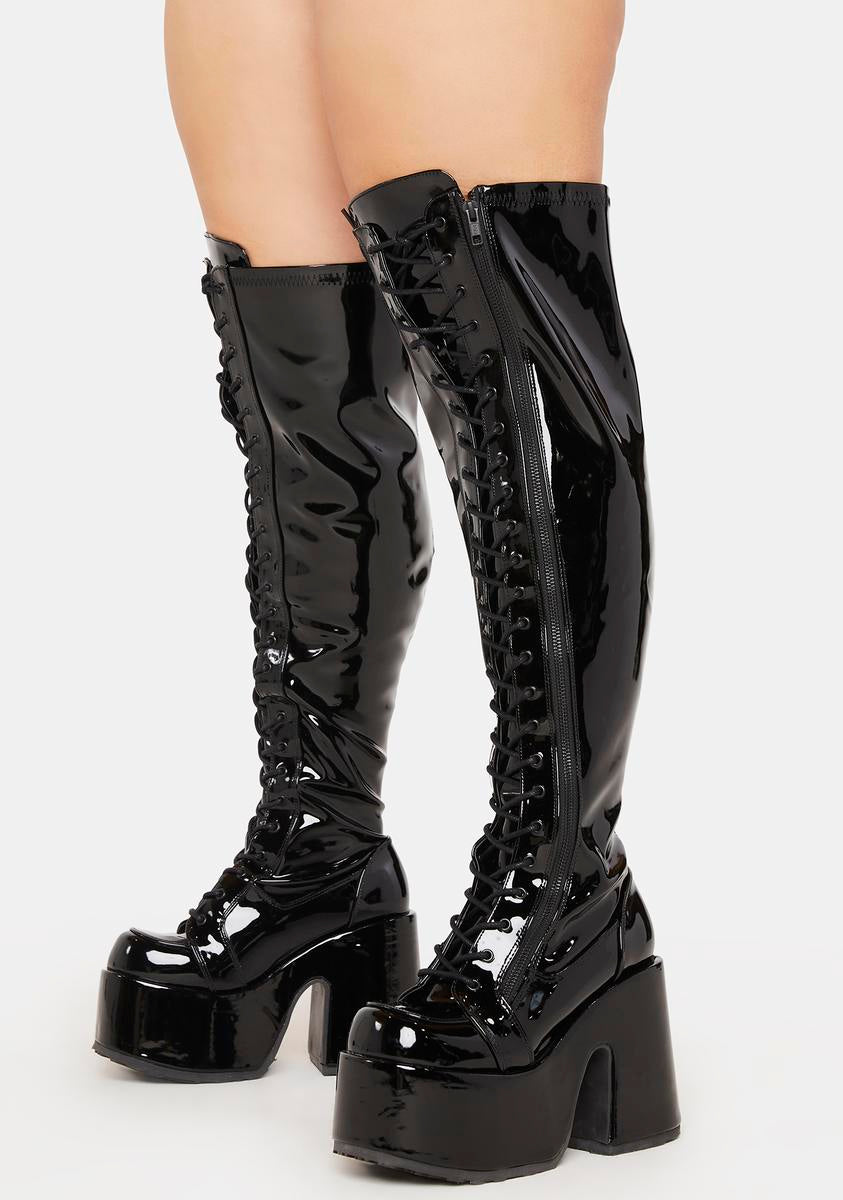 should we curtsy? These sexxxy thigh high boots have a patent stretch vegan leather material with a wide calf construction, platform soles with chunky heels, adjustable lace-ups, and side zip closures.