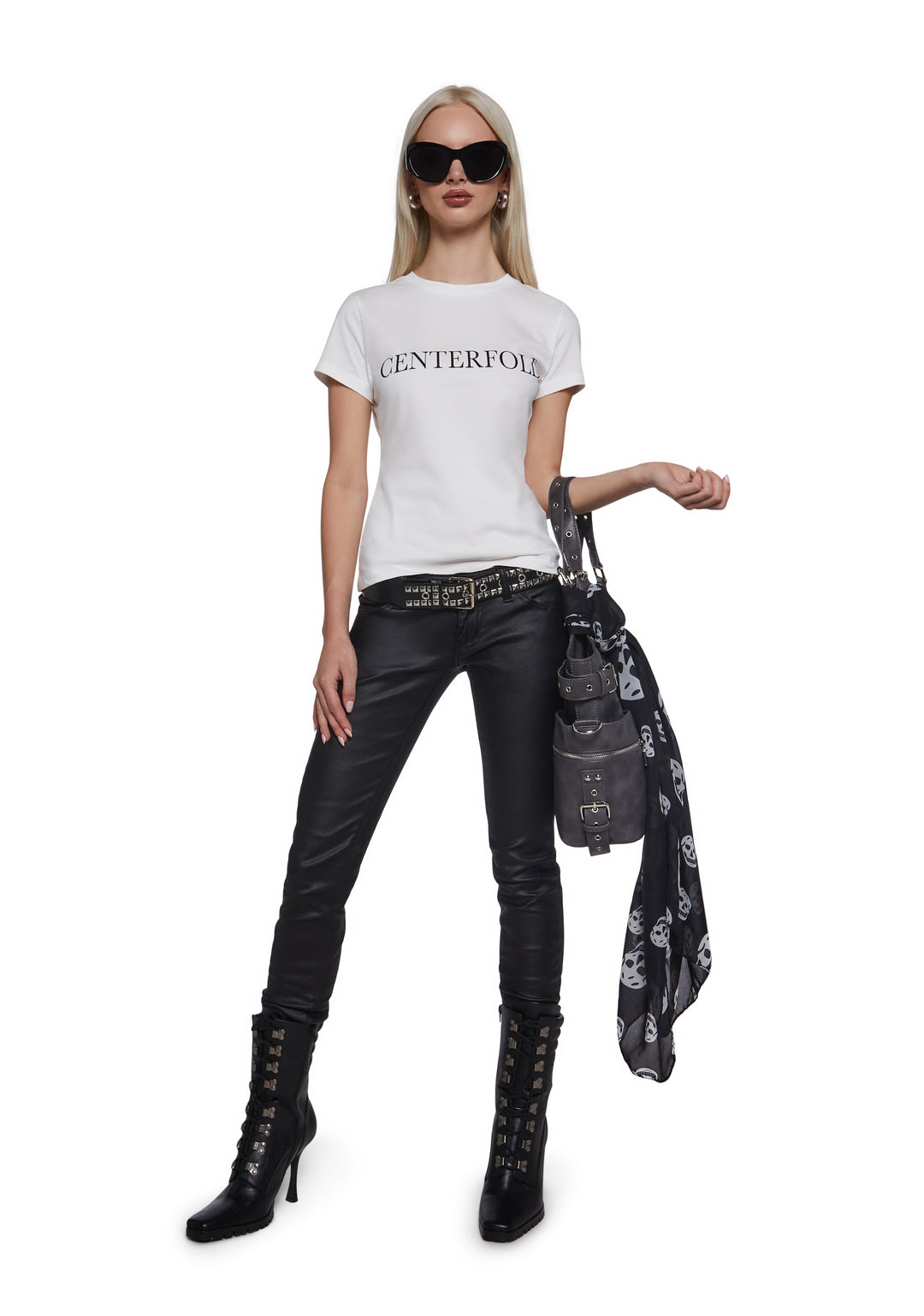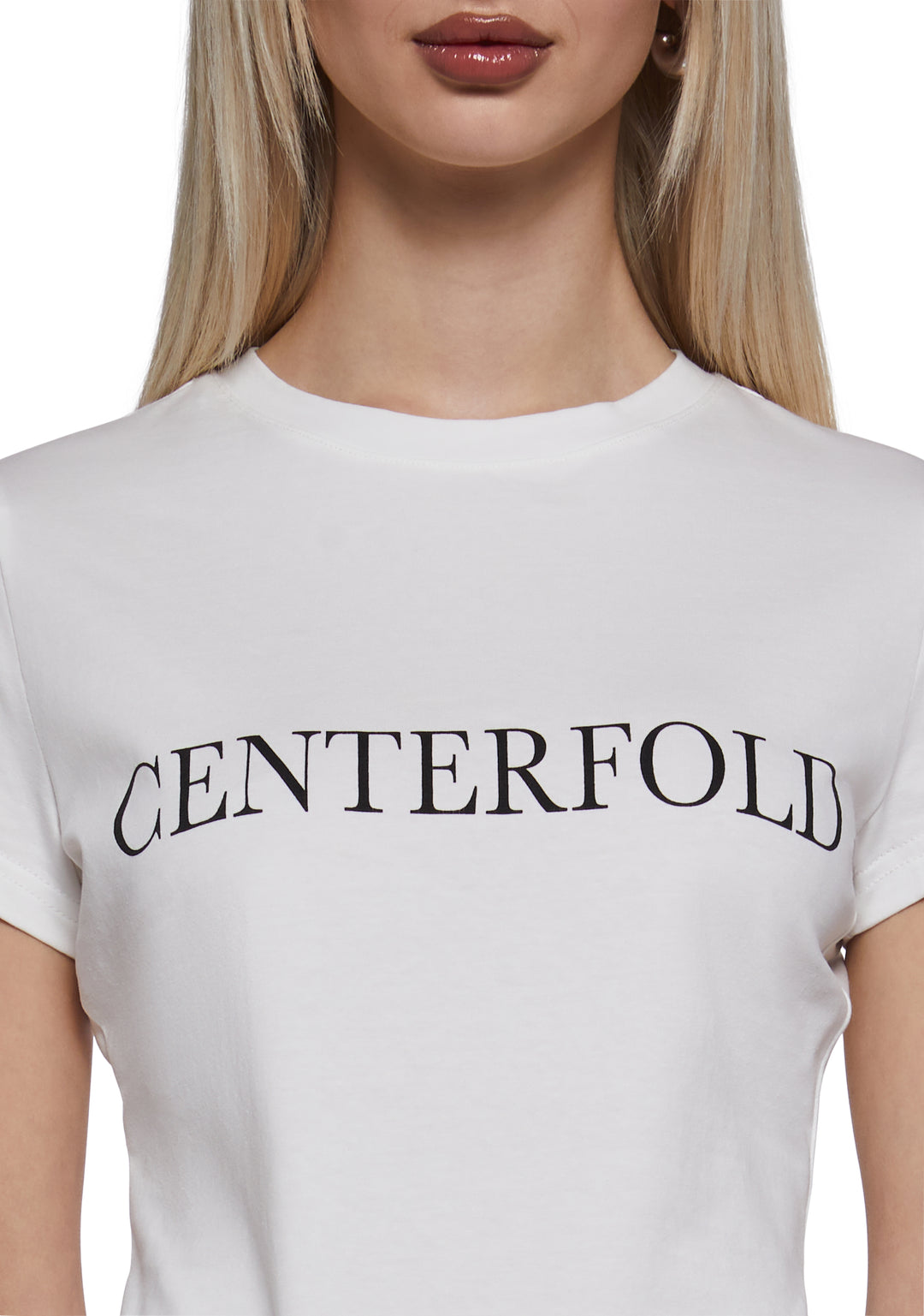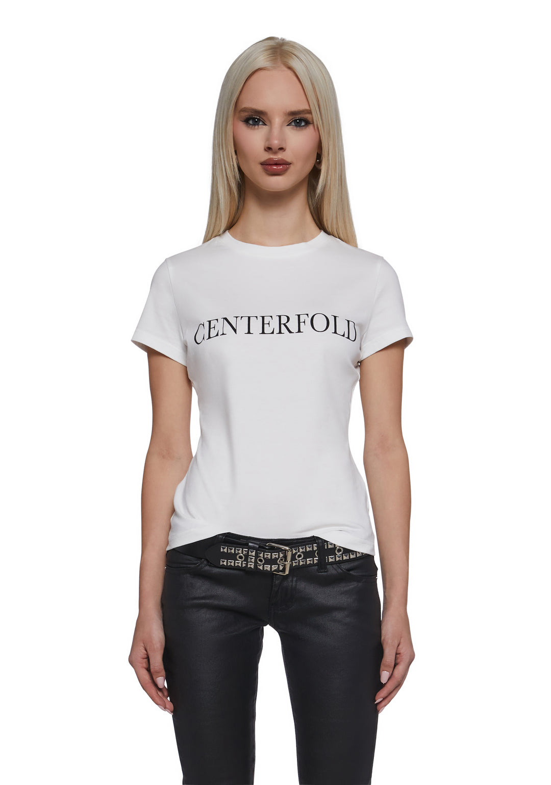 Clean and classic, this fitted white tee features a timeless crew neckline and bold Centerfold logo detail. Crafted from soft, stretchy fabric, it??s an everyday essential that pairs effortlessly with any look.