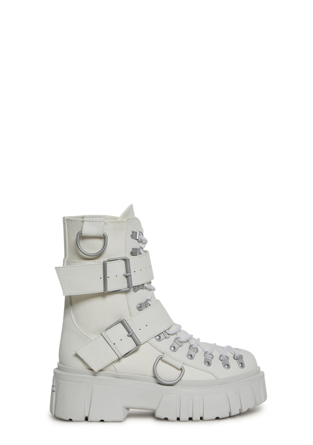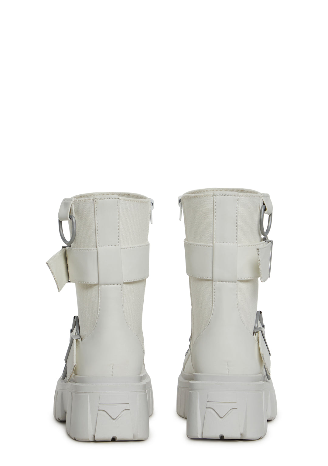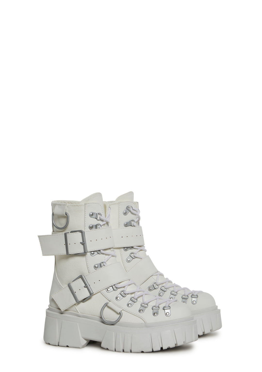 cuz once ya do a double-cross, ya gotta be ready to fight! Get gnarly in these chunky combat boots that have a canvas twill and a vegan leather construction, adjustable lace-ups, D-ring hardware, double buckled straps, and side zip closures.