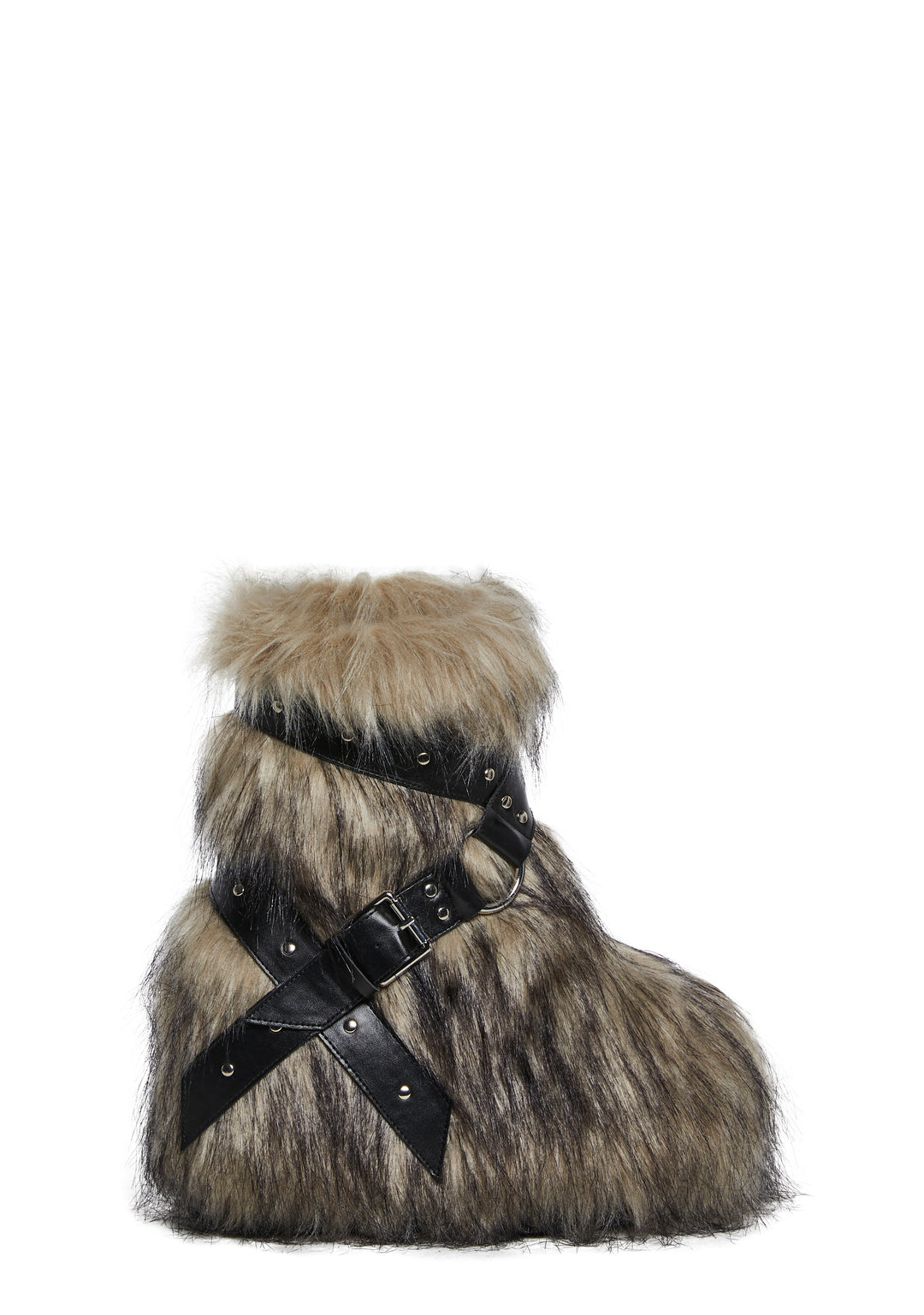 cuz adventure is calling. These platform boots have a faux fur construction, a pull-on fit, platform soles, and adjustable wrap buckle straps with O-ring hardware.