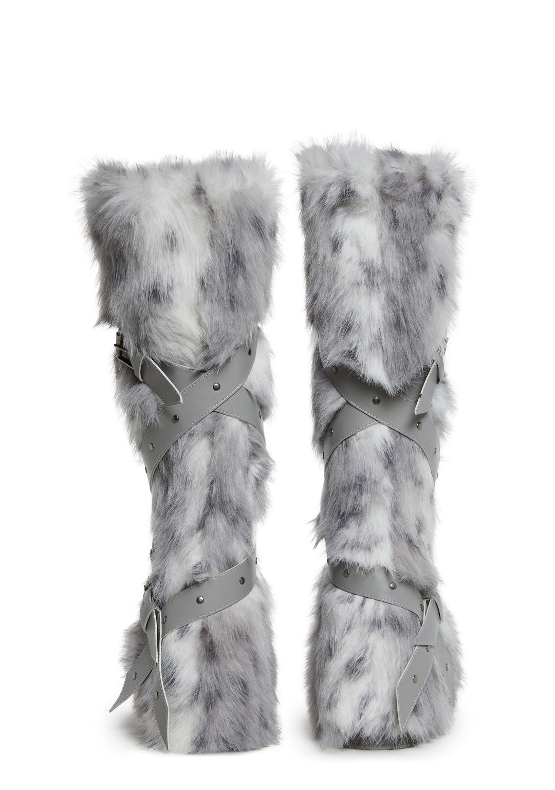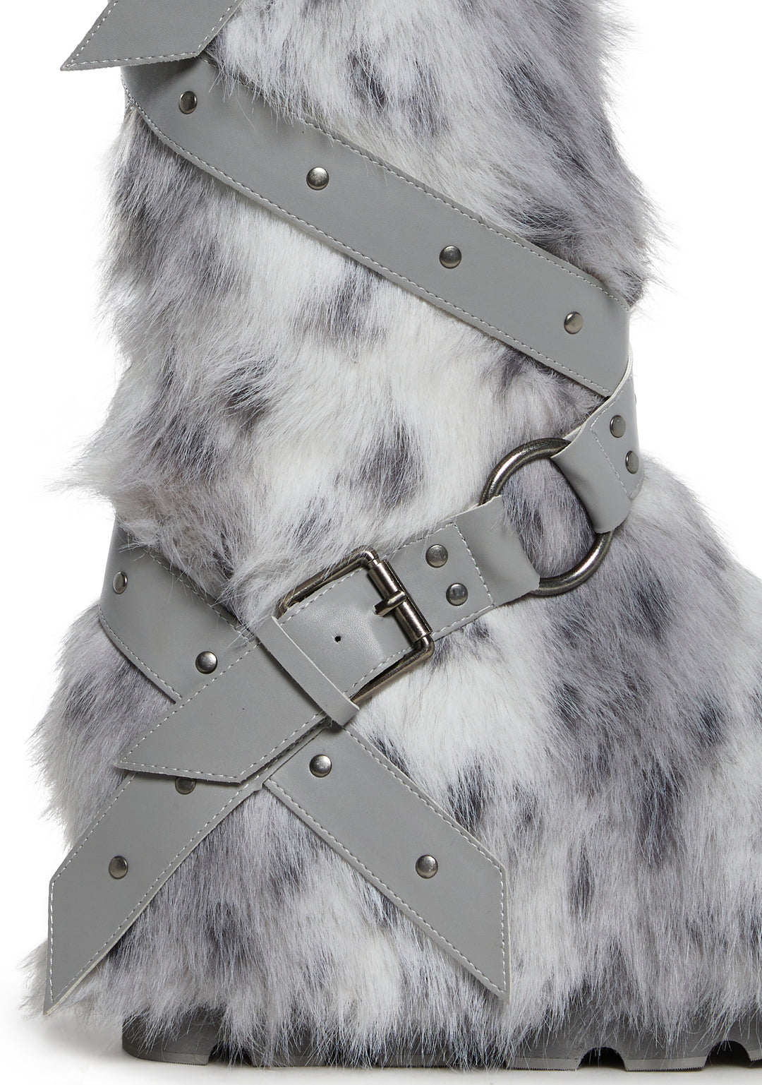 cuz adventure is calling. These knee high boots have a faux fur construction, a pull-on fit, wedge platform soles, and adjustable wrap buckle straps with O-ring hardware.