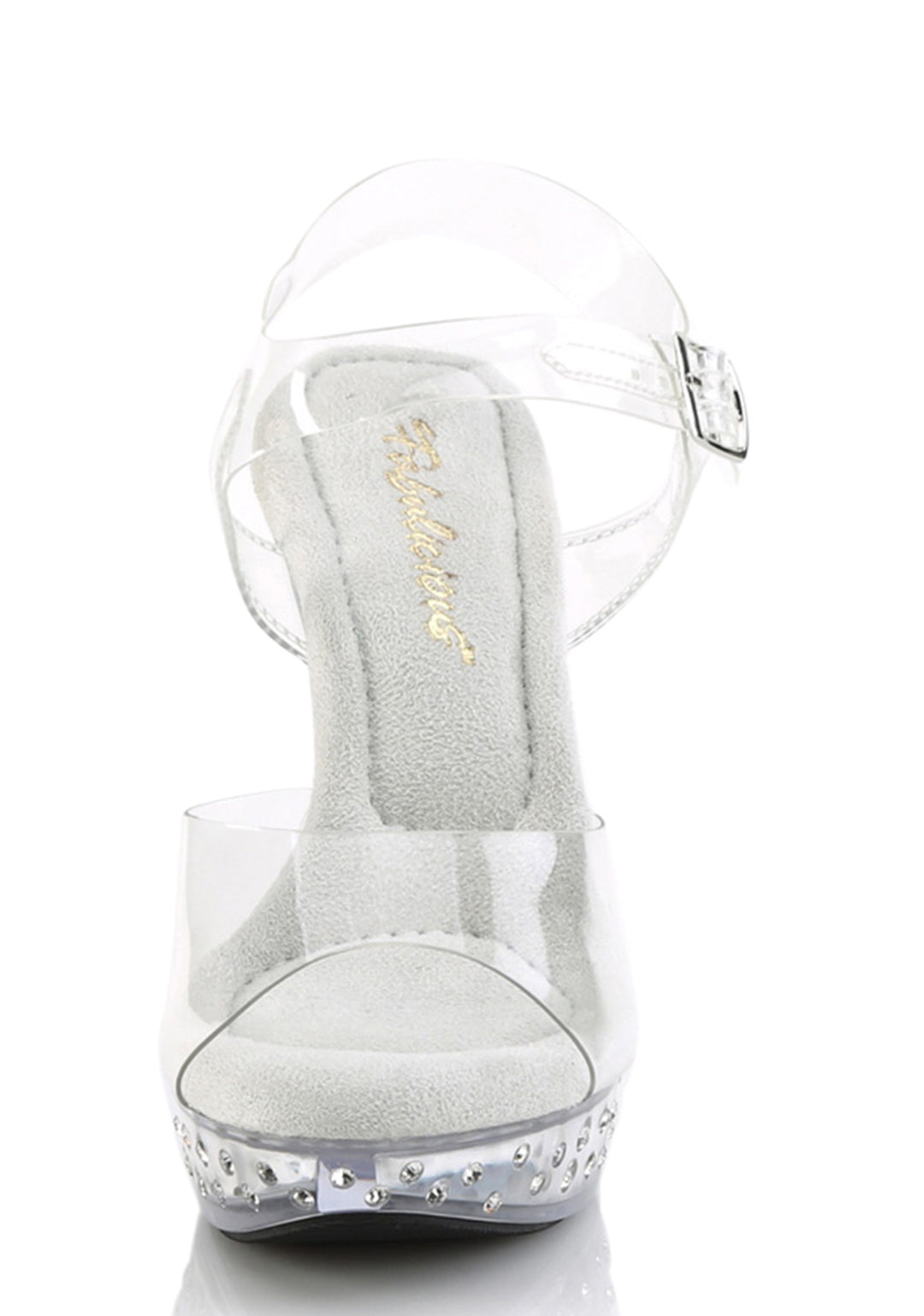Give ’em sumthin’ to talk about while wearing these sandal platform heels with a clear sole and rhinestone studding and clear pvc upper construction.