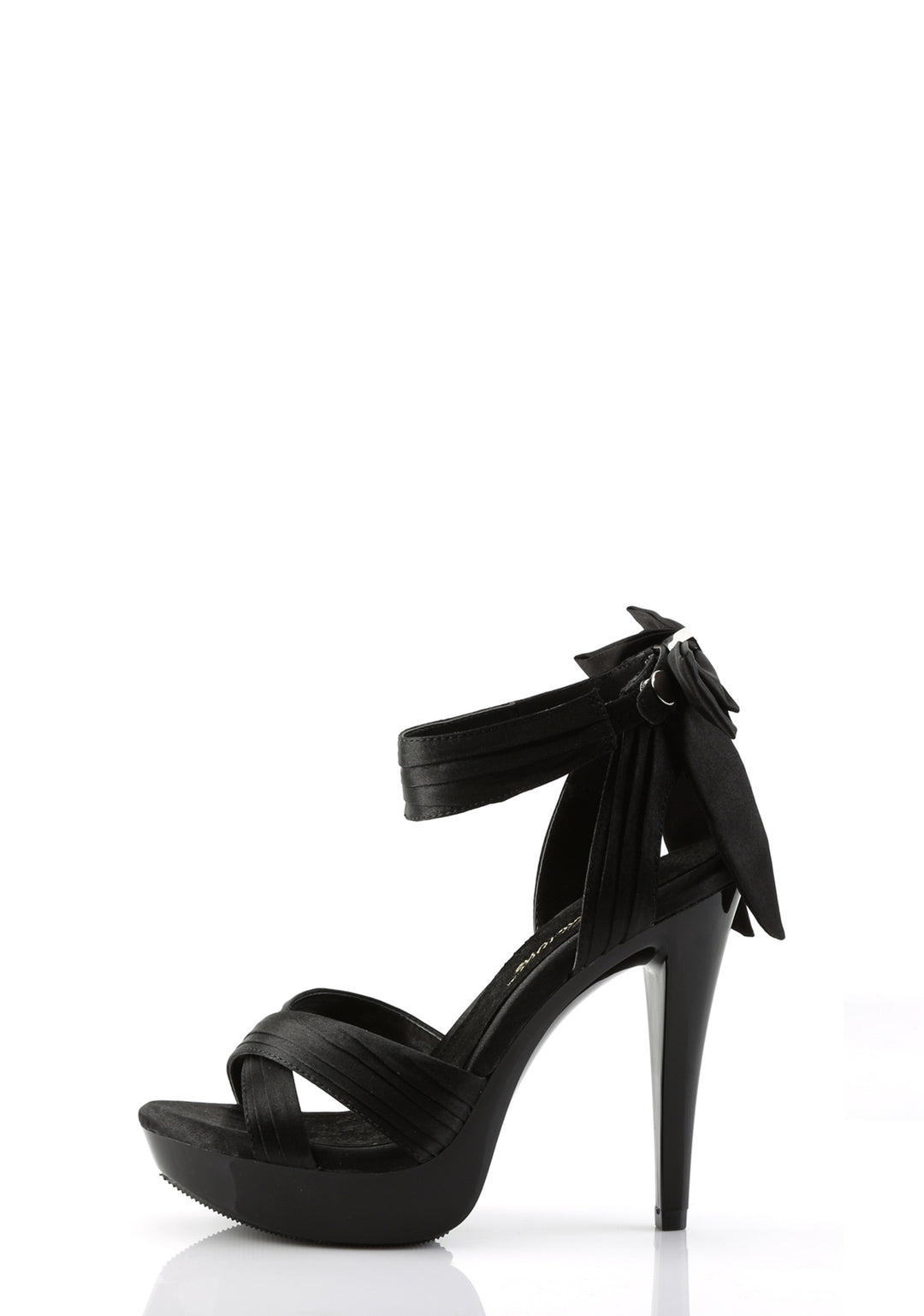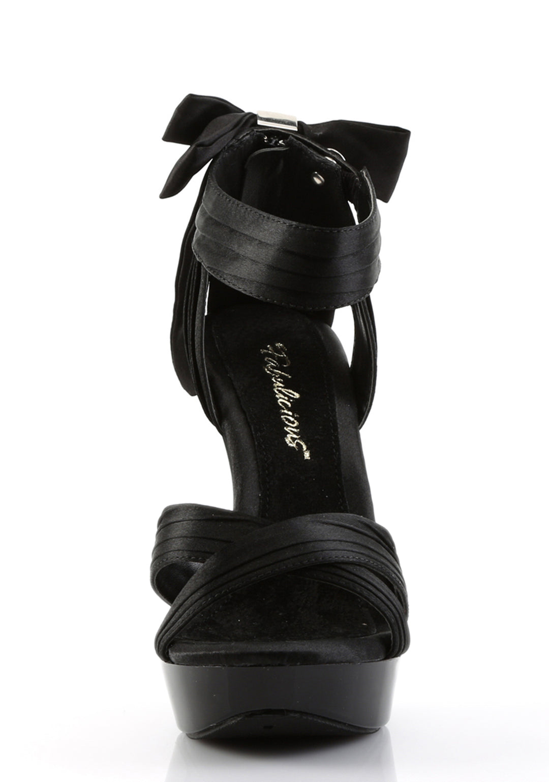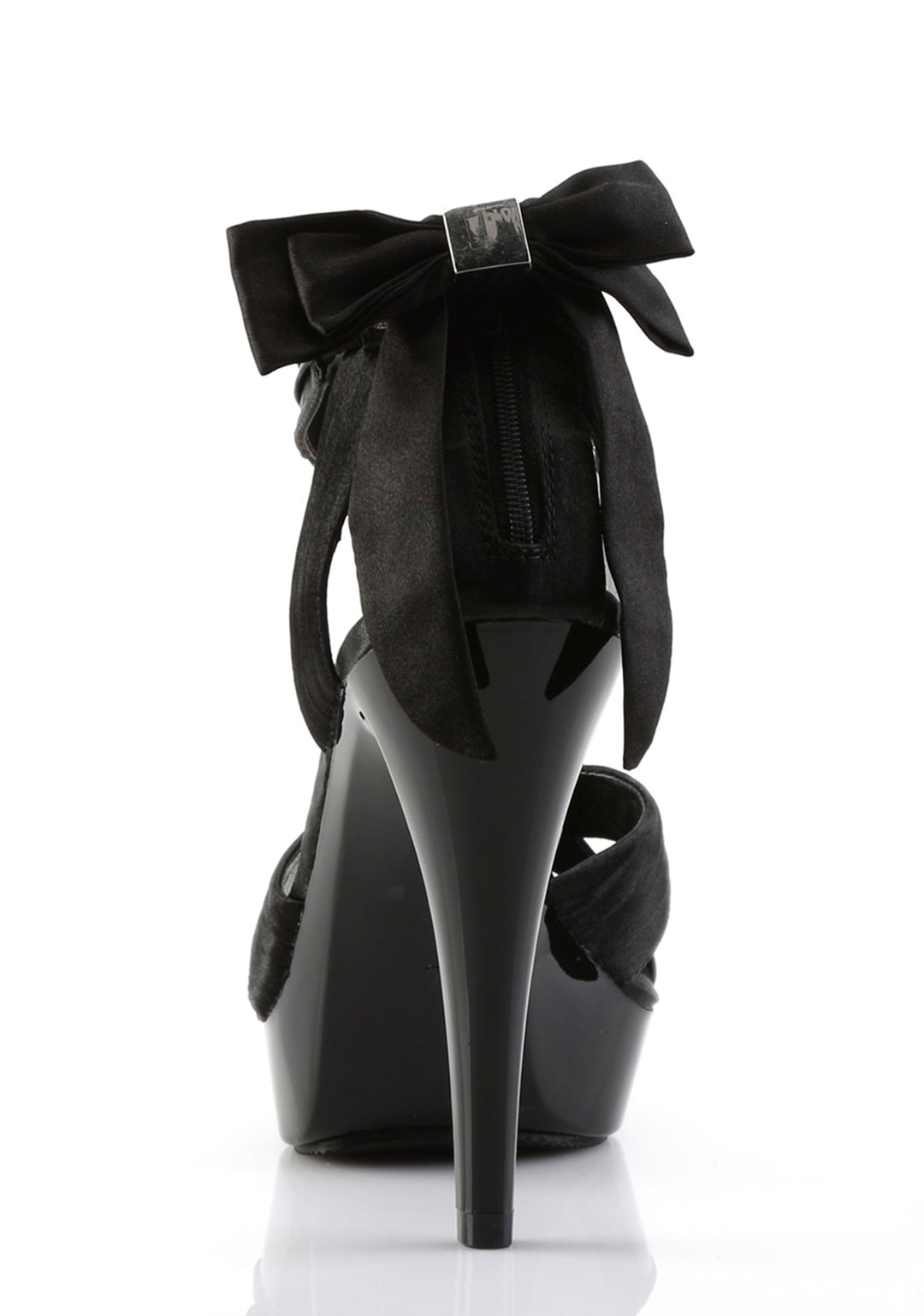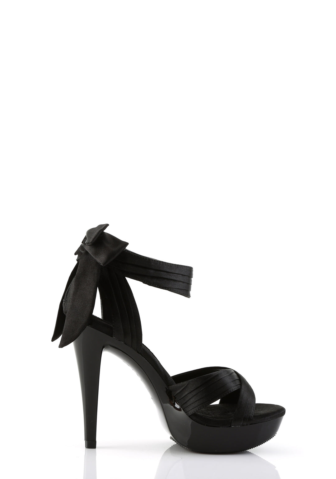 These shoes have a satin ribbed construction, a wrap design on the uppers, platform soles, stiletto heels, bows on the back and zipper closures.