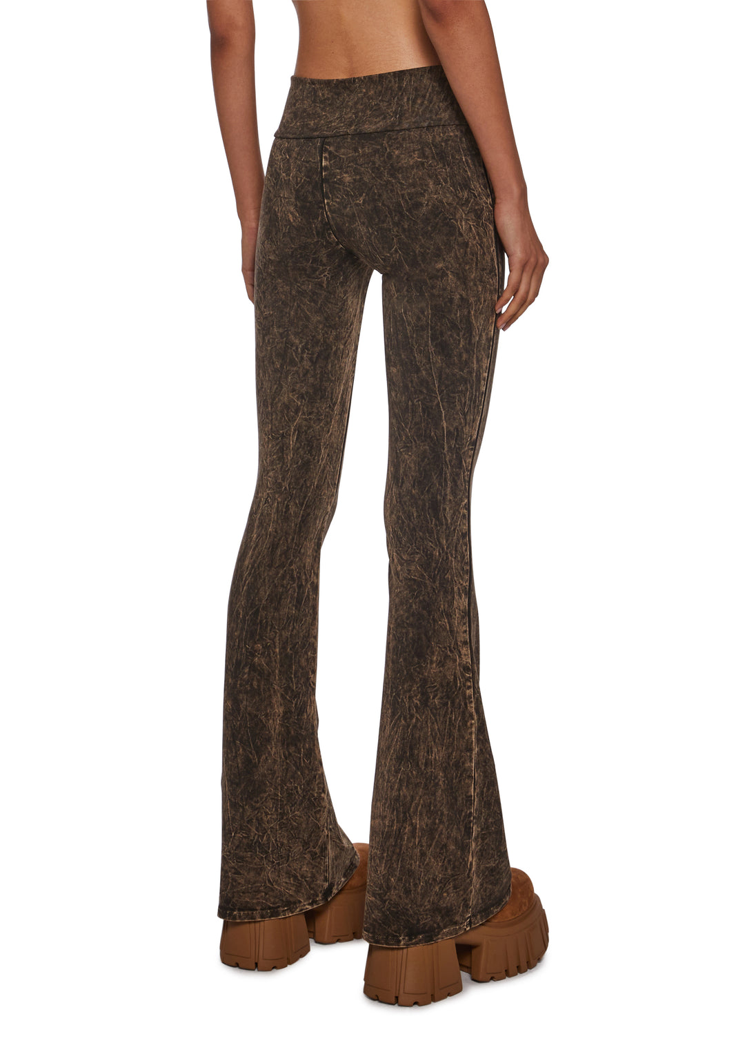 These pants havea stretchy washed cotton ribbed construction, exposed stitching, an elastic waistband, and a flared leg silhouette.