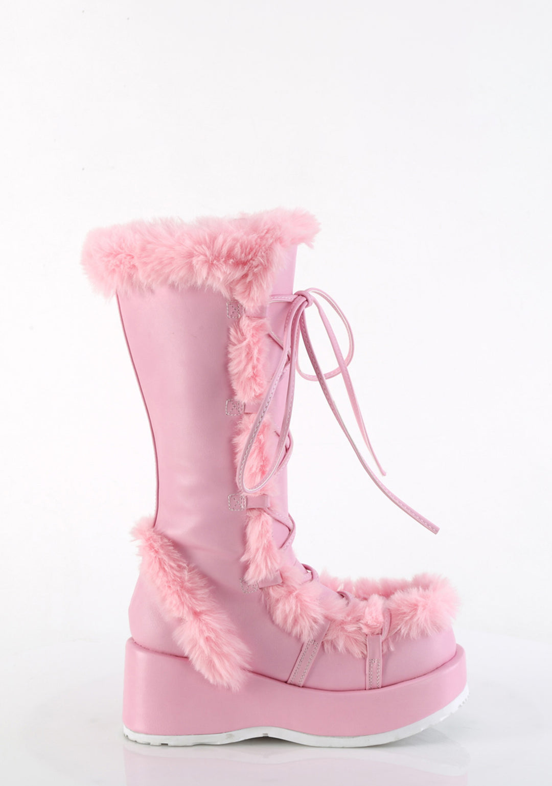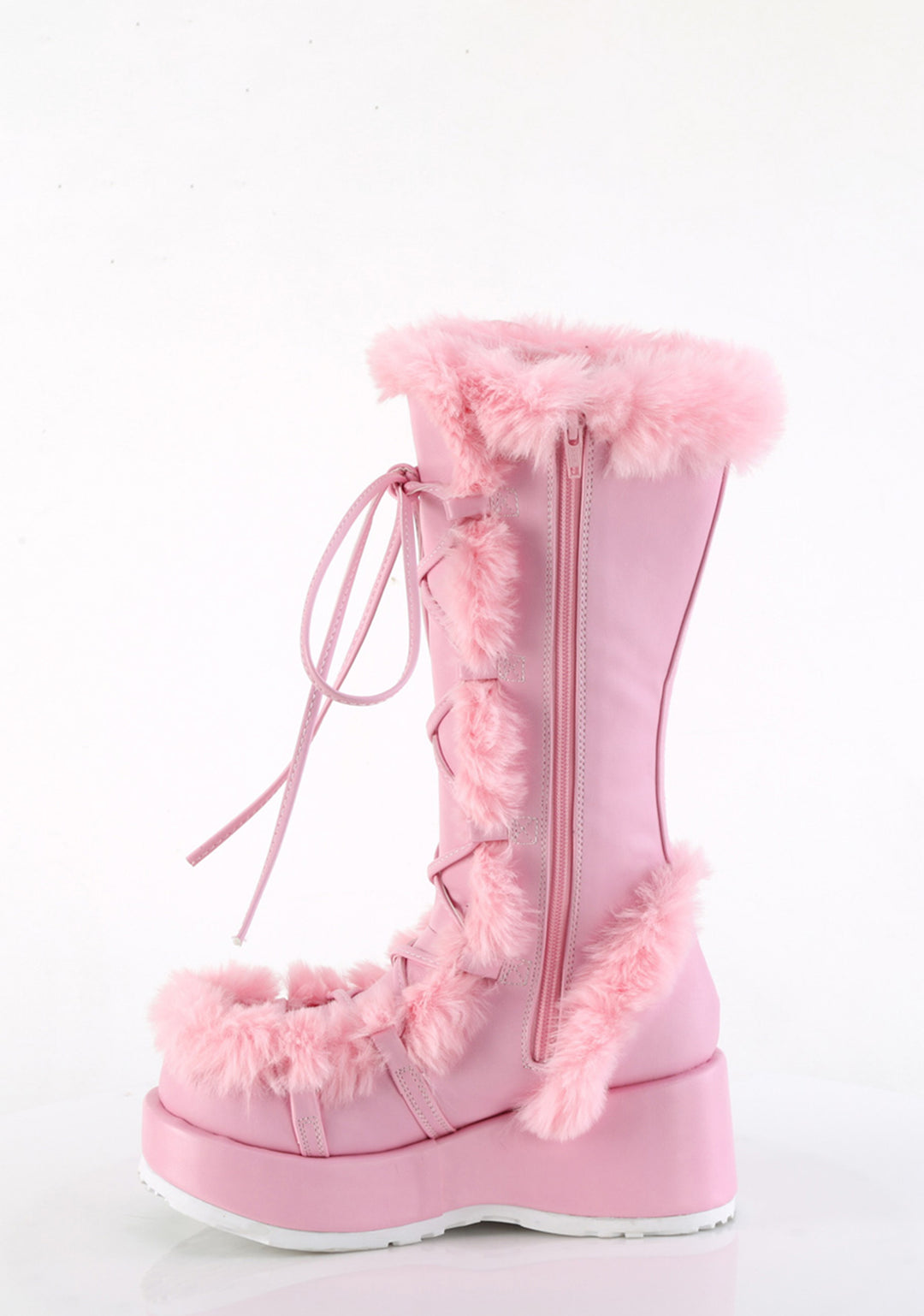 cuz you’re a vision of wonderland, babe! Let ’em know the arctic goddess has arrived in these knee high boots that have a vegan leather construction, fluffy faux fur trim, lower inch platform soles, adjustable lace-ups, and side zip closures.