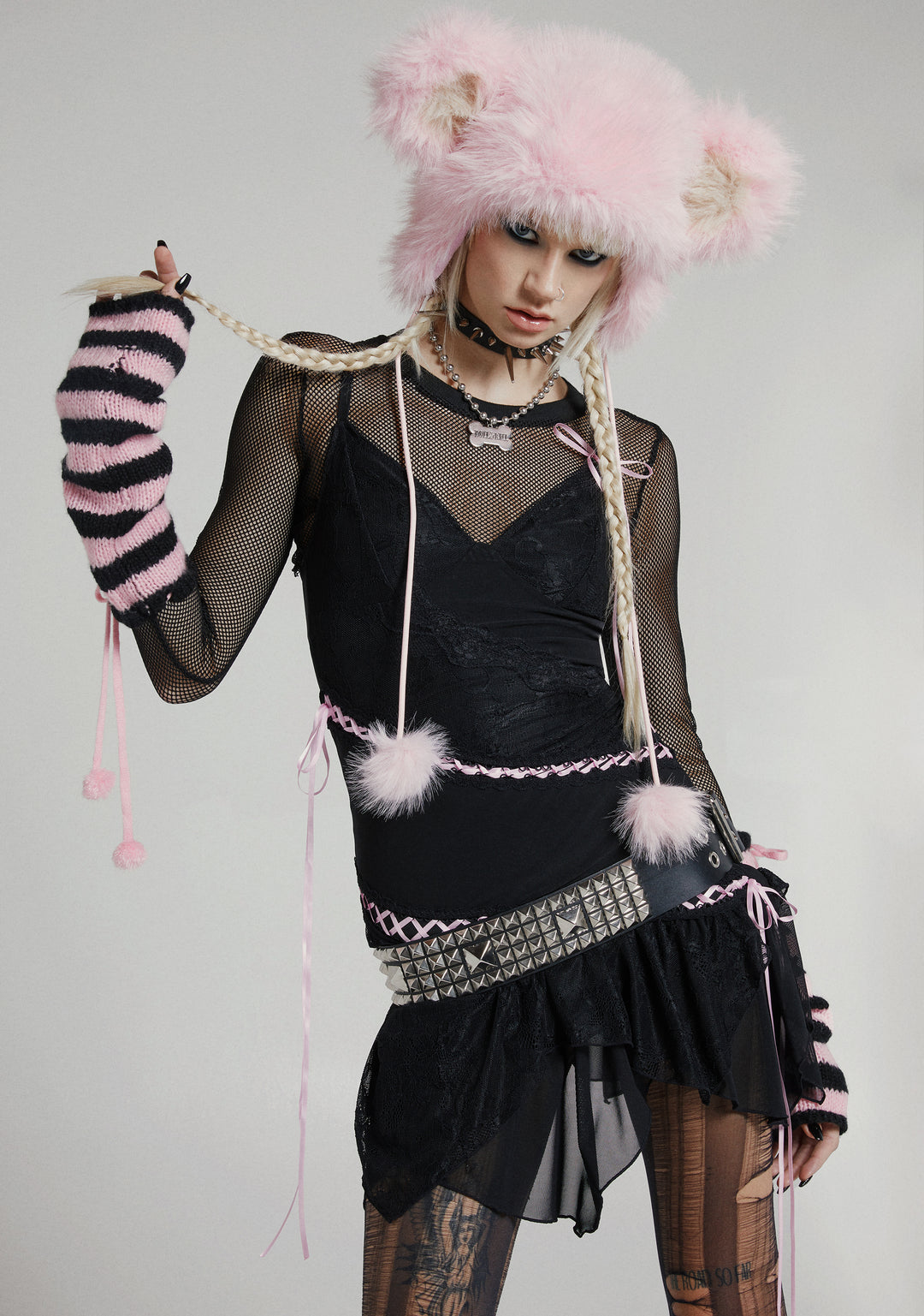 Look very approachable in this mini dress that has a mesh and lace construction, a paneled design, adjustable shoulder straps, interlocking ribbon detailing, ribbon bows on the sides, and a handkerchief hem.
