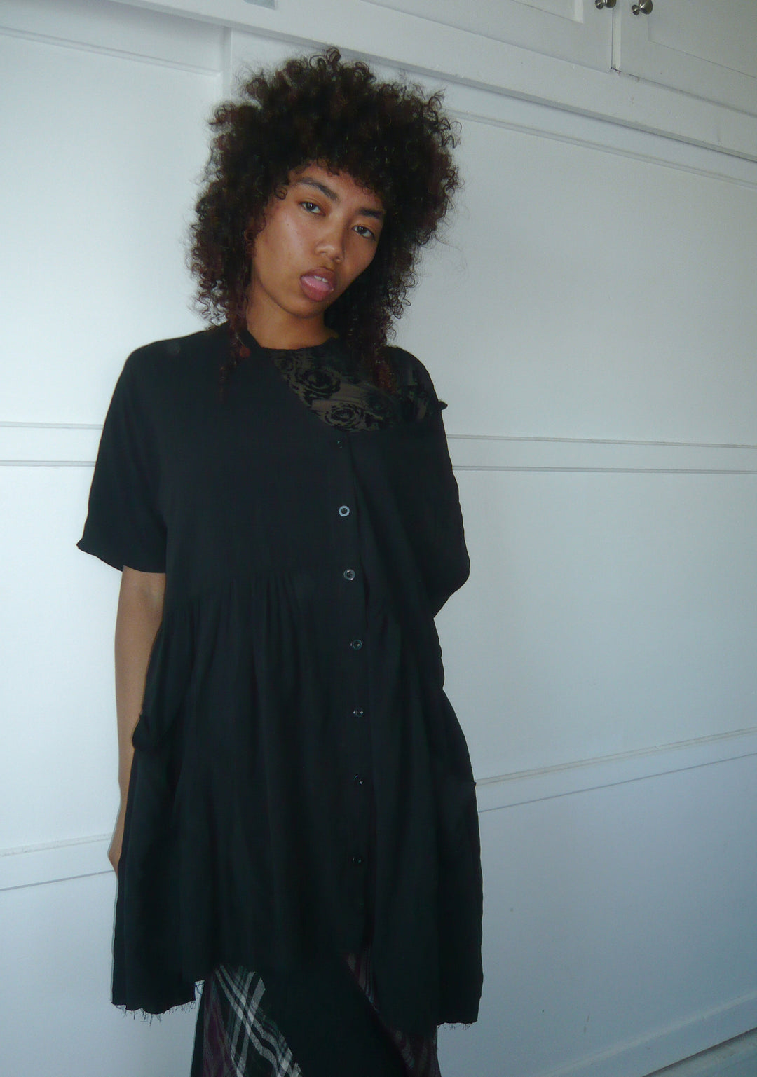 has you breakin’ the glass ceiling! This babydoll dress has a non-stretch woven construction, a scoop neckline, elbow-length sleeves, front button closures, and an oversized fit.