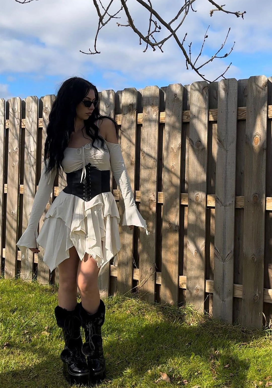 cuz you make this world magical. This mini dress comes with off the shoulder sleeves, spaghetti straps with tie closures, ruching at the chest with a tie closure, and a handkerchief detail, hem, and cuffs.