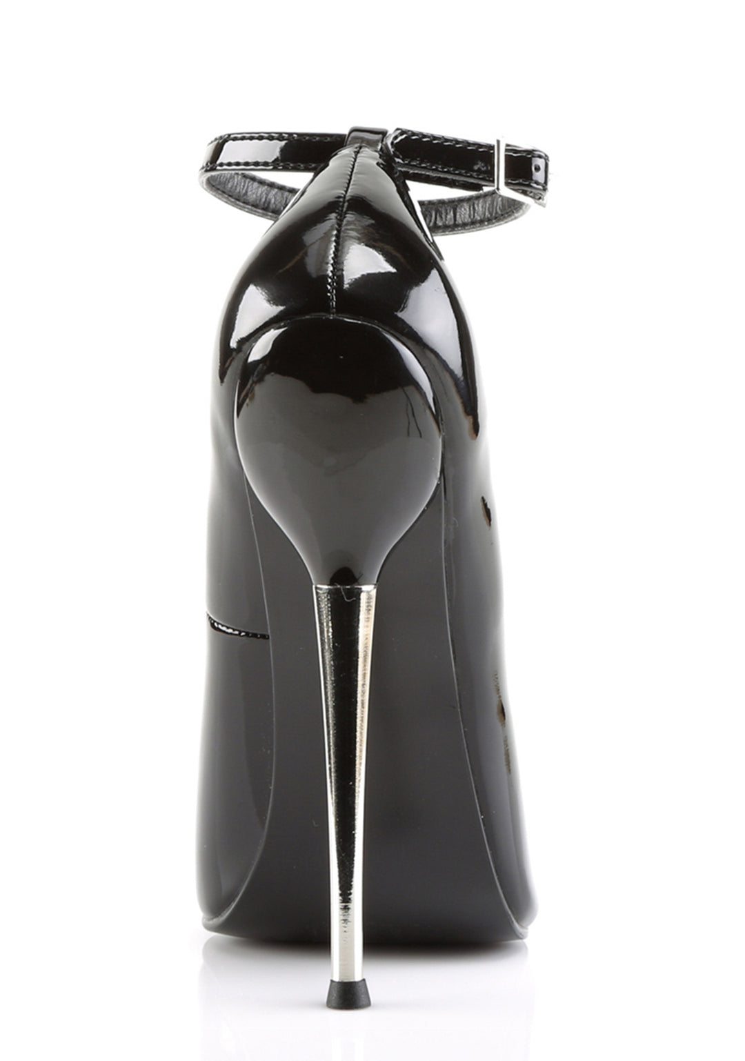 These heels have a vinyl construction, a pointed toe design, solid brass stiletto heels, and adjustable ankle buckle closures.