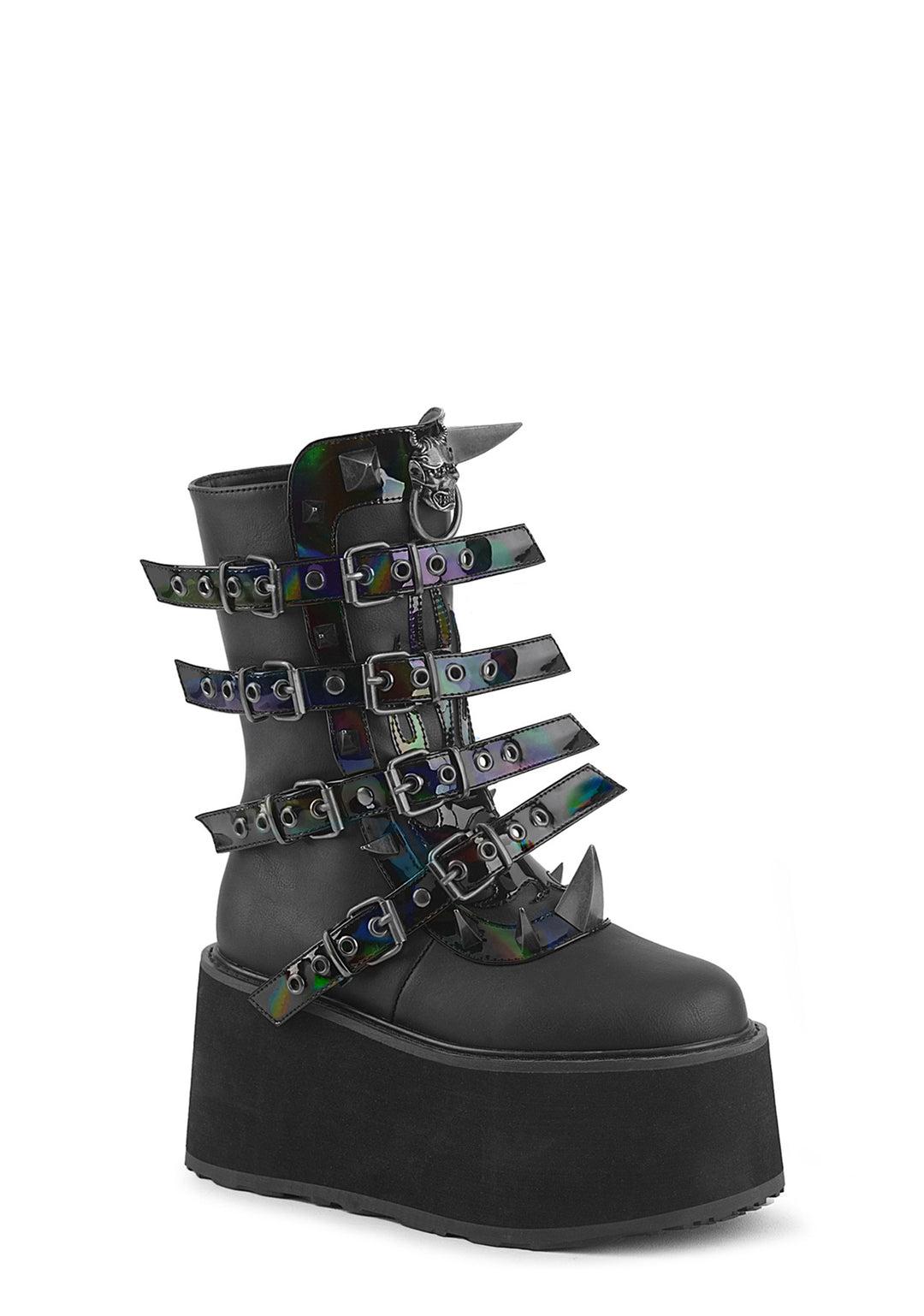 These boots have a vegan leather construction, spiked details, and adjustable straps.