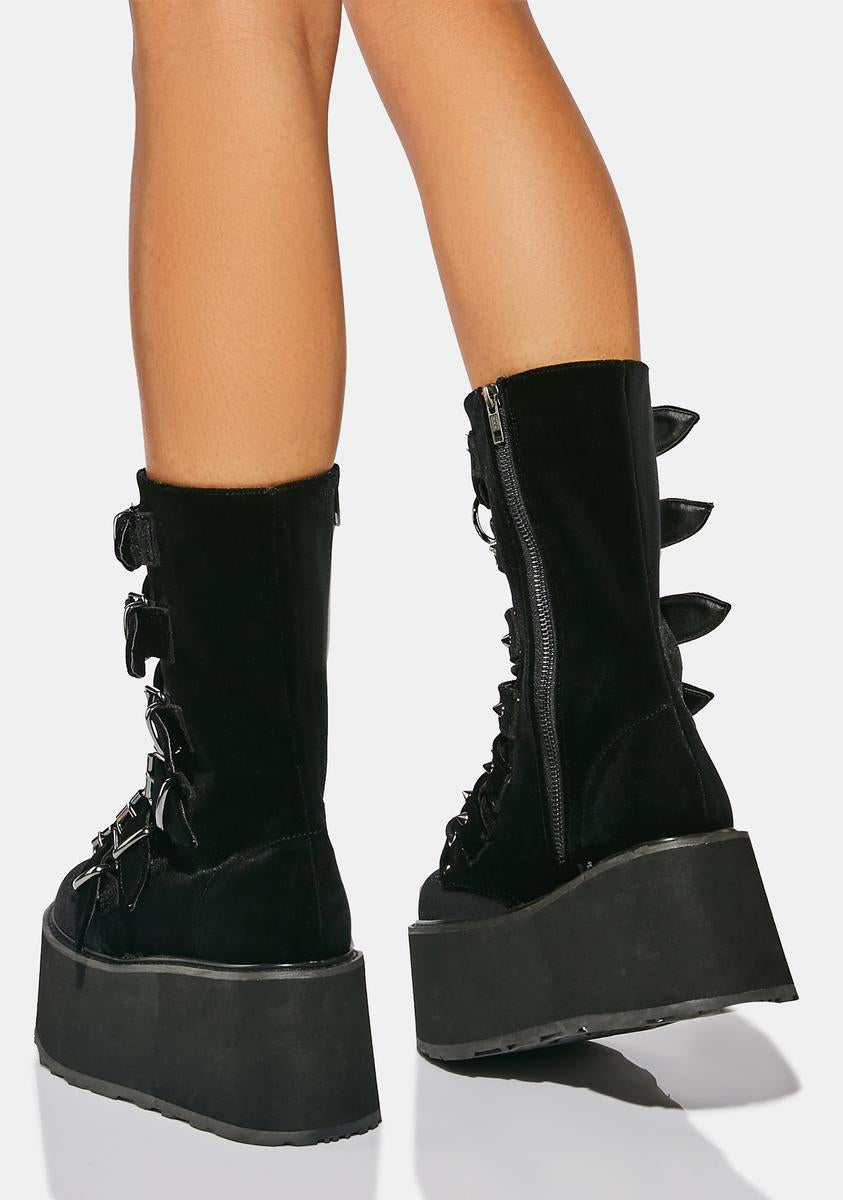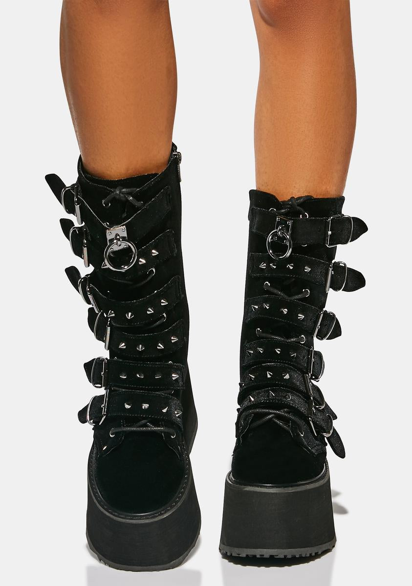 cuz you’re a babe on a mission. Take control in these velvet platform boots that have buckle straps with spiked studs, O-ring hardware on the front, adjustable laces, and side zip closures.