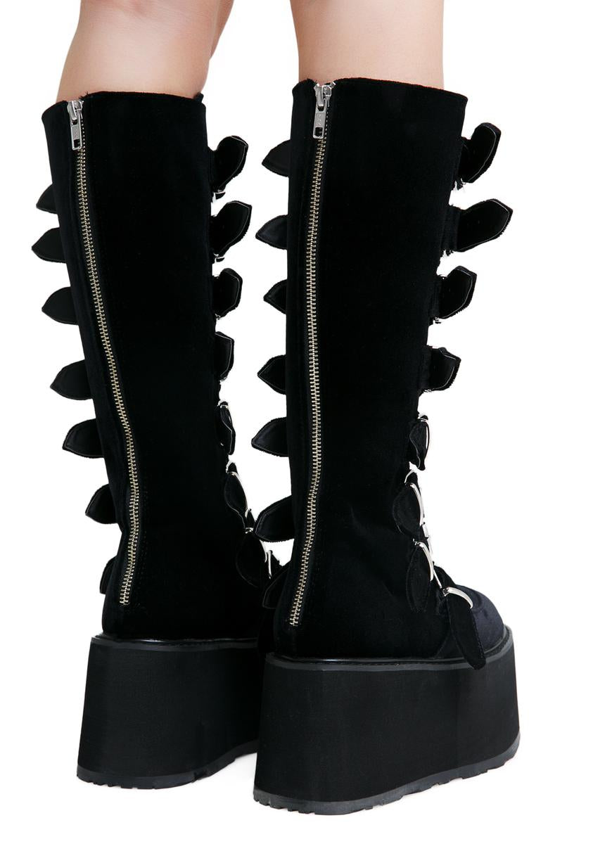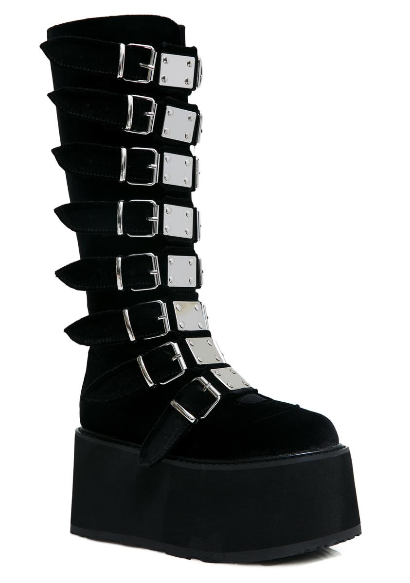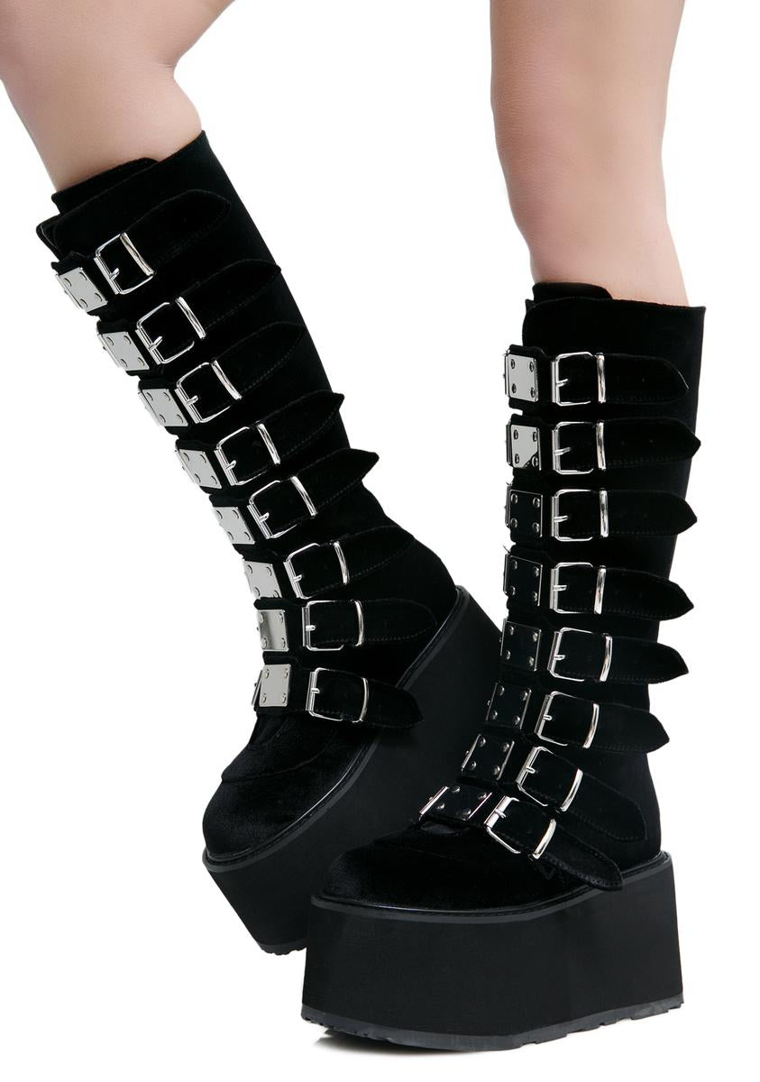 take the red pill, babe. These black velvet boots have multiple metal badazz buckles, comfy flat platforms, and back zipper closures.