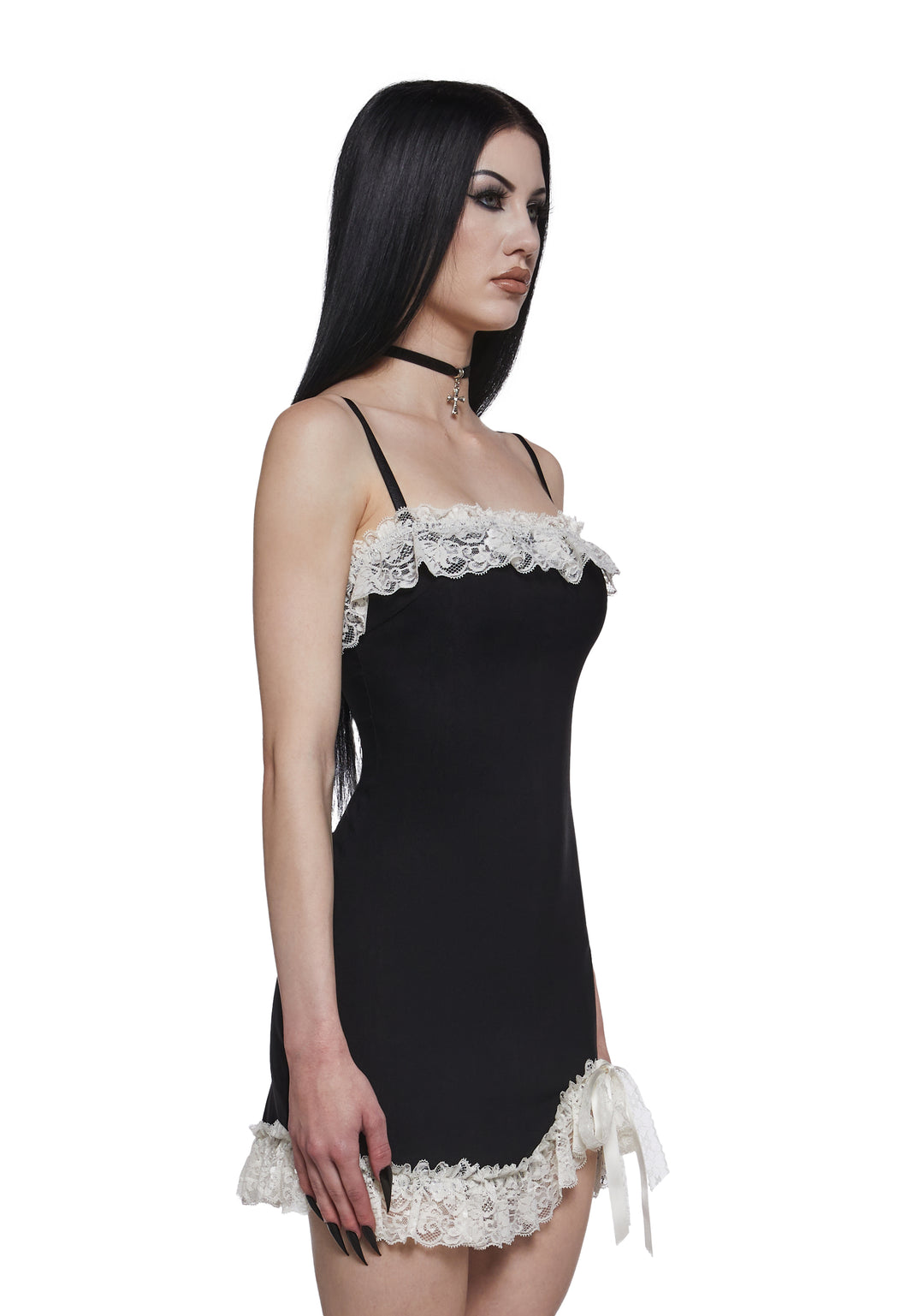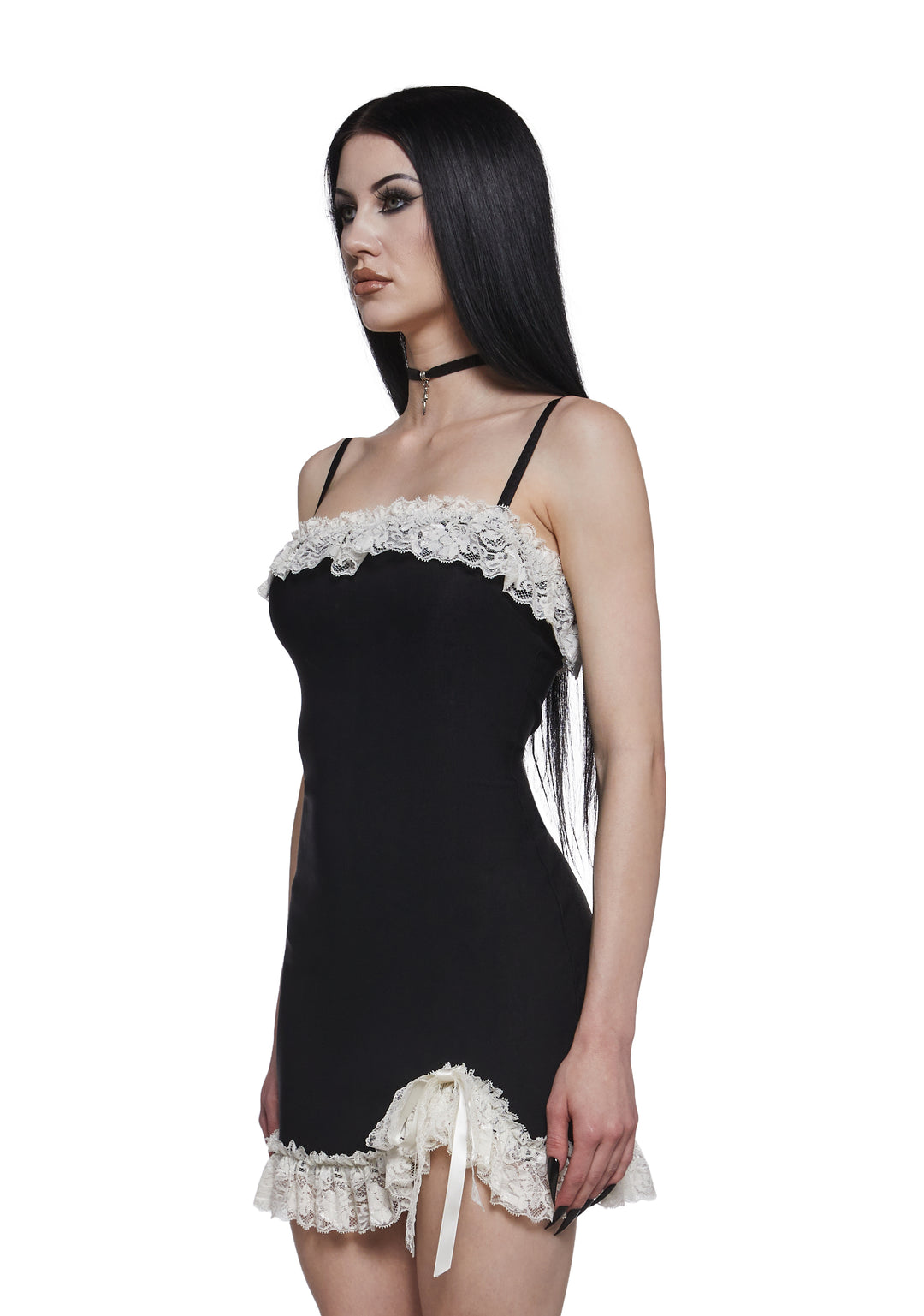 Romantic with a dark edge, this mini dress features delicate lace trim along the neckline and hem for a soft, feminine contrast. Designed with a figure-hugging silhouette and a ruched side detail, it delivers a flattering fit with subtle allure.