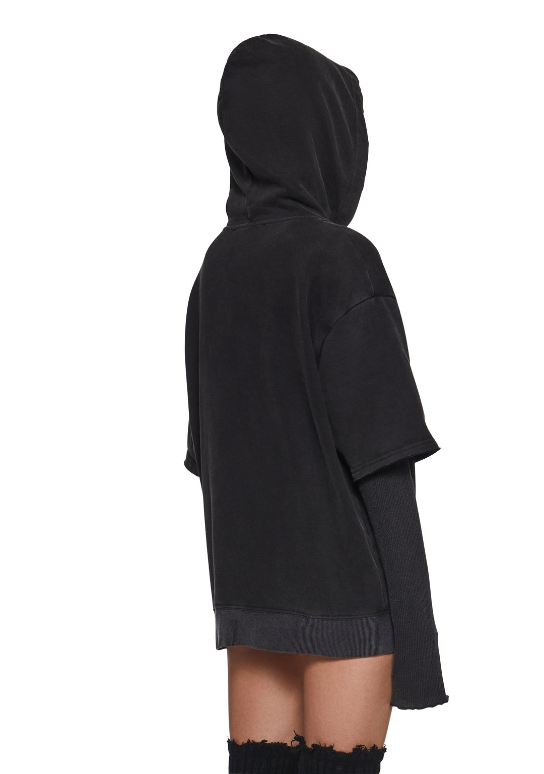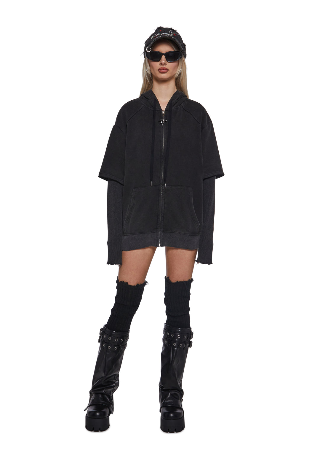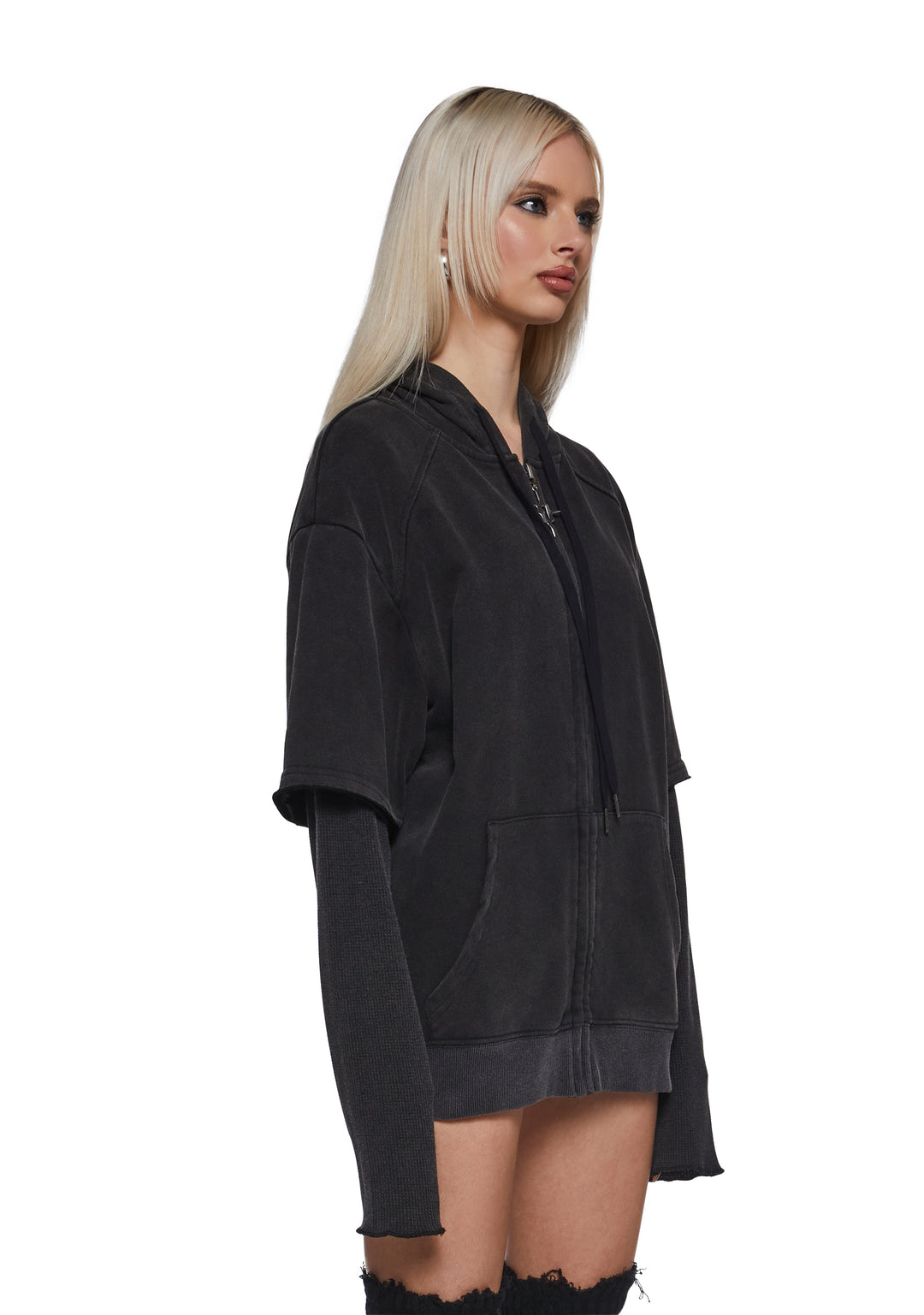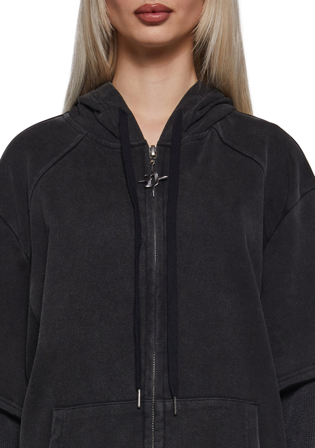 in a stretchy cotton and waffle knit construction with an oversized fit. Drawstring ties, long sleeves, kangaroo pockets, raw edges, Darker Wavs logo on the back, and front zip closure with ??D?? logo charm.