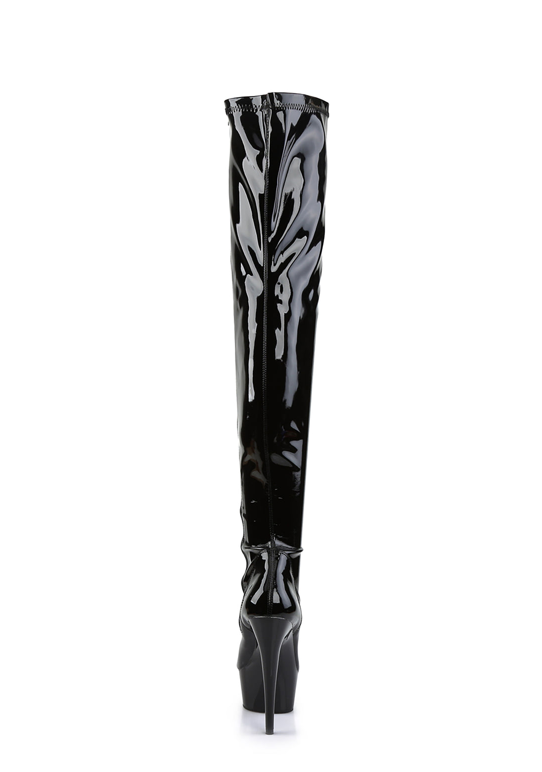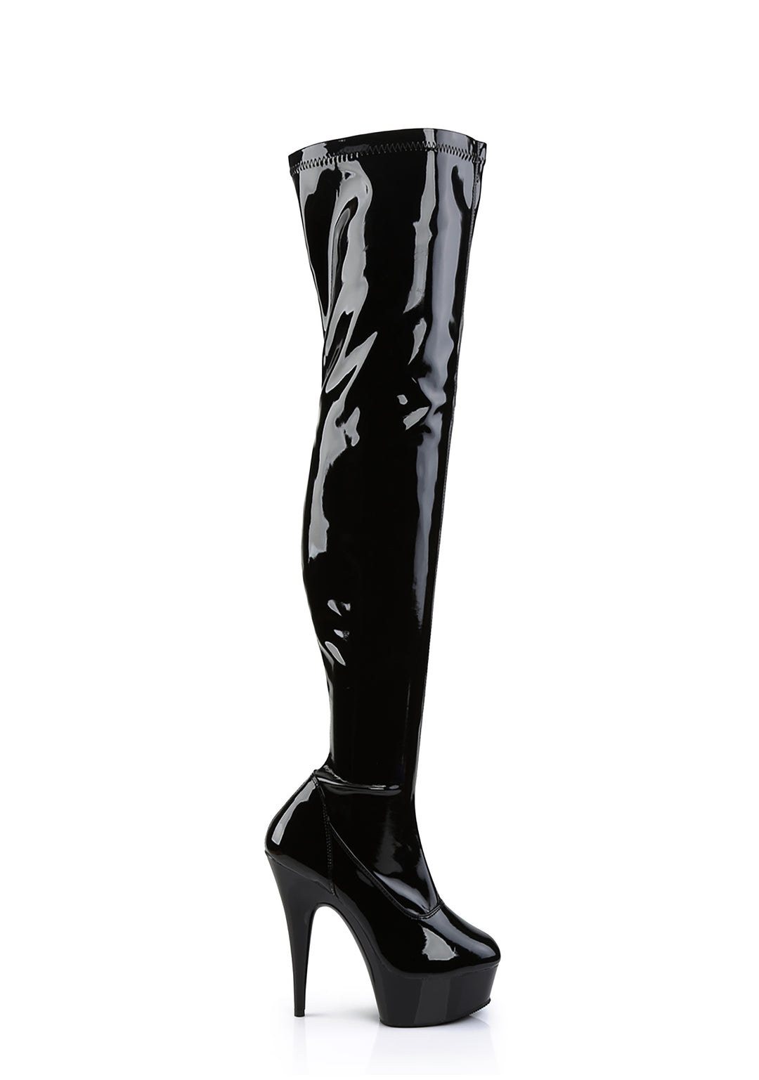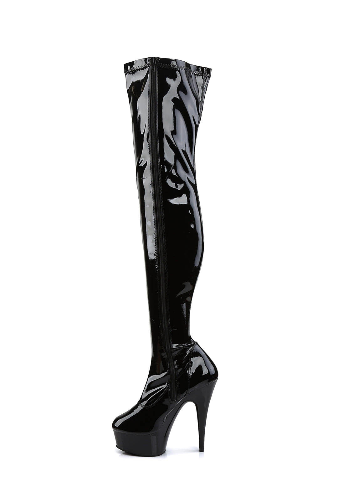 cuz you’re sexy in the night. These thigh high boots have a slick patent construction, thick platforms, stiletto heels, and side zip closures.