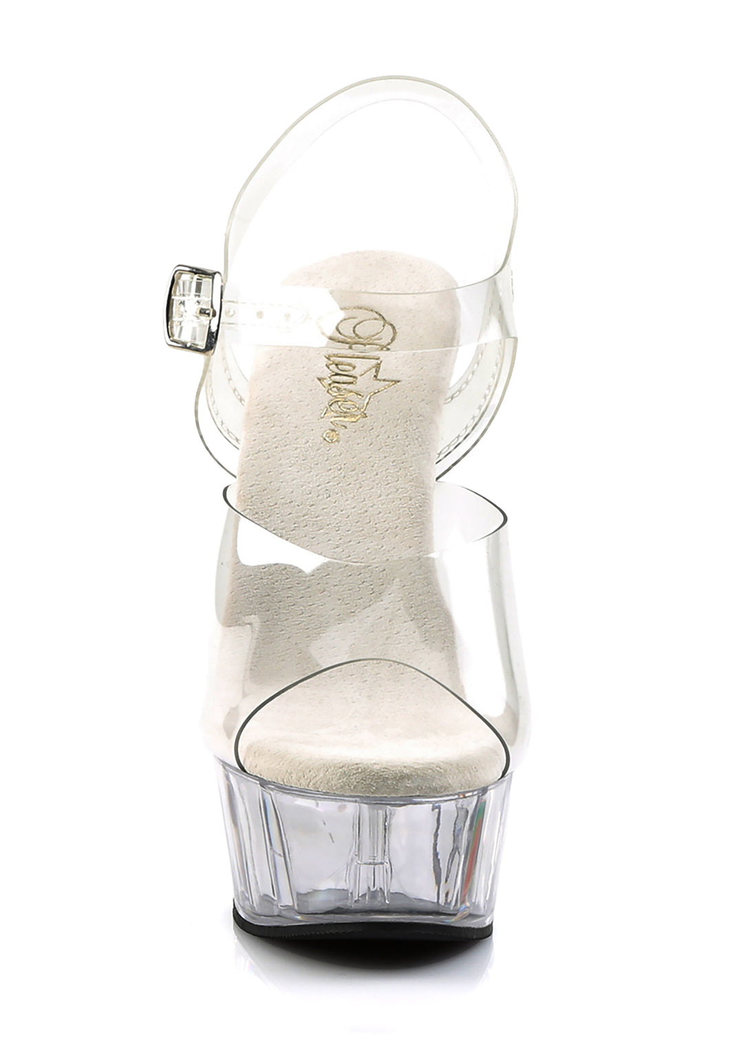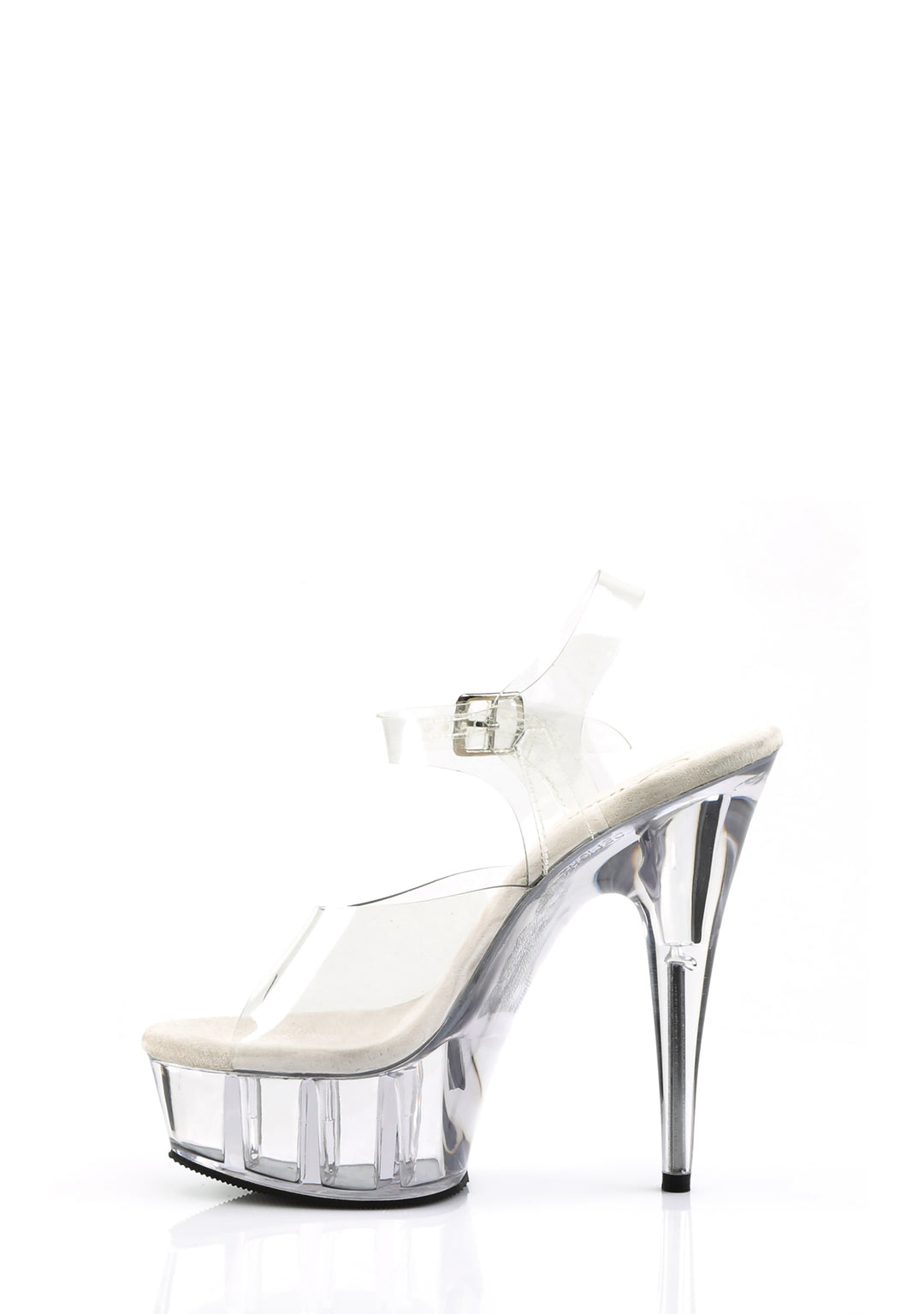 These shoes have clear vinyl uppers, a peep toe design, platform soles, stiletto heels, and adjustable ankle buckle closures.