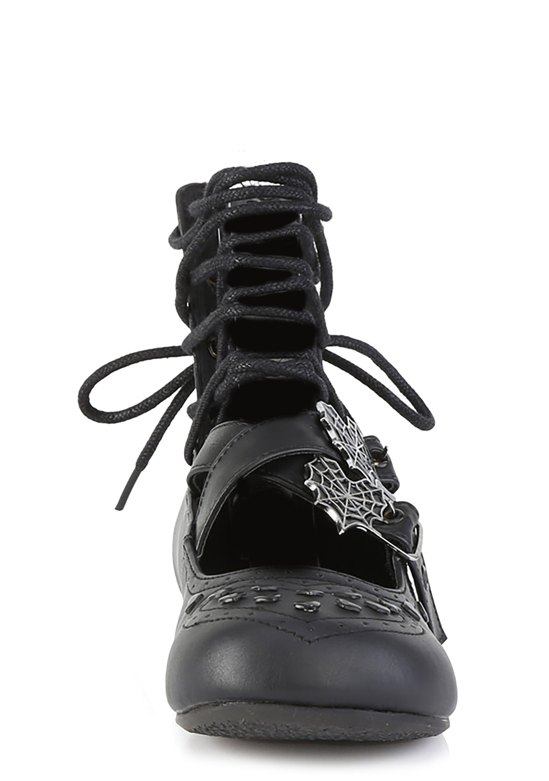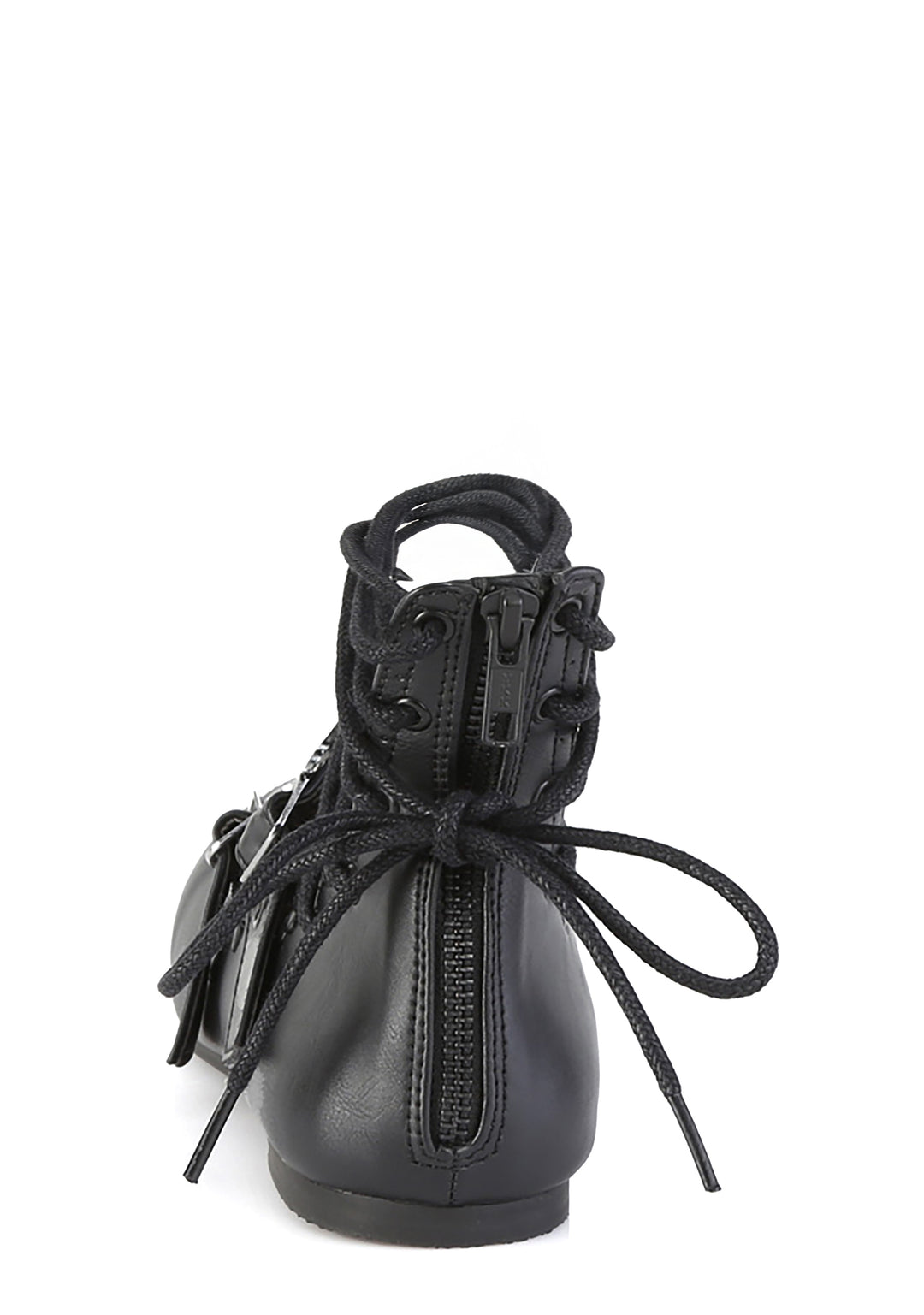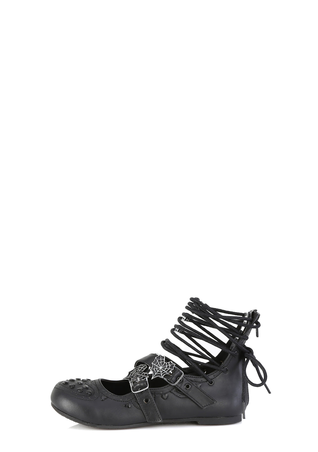 These flats have a vegan leather construction, heart studs and heart shaped stitching on the uppers, lace-up eyelets, heart spider web buckle strap closures, and back zipper closures.