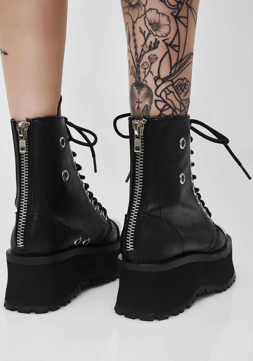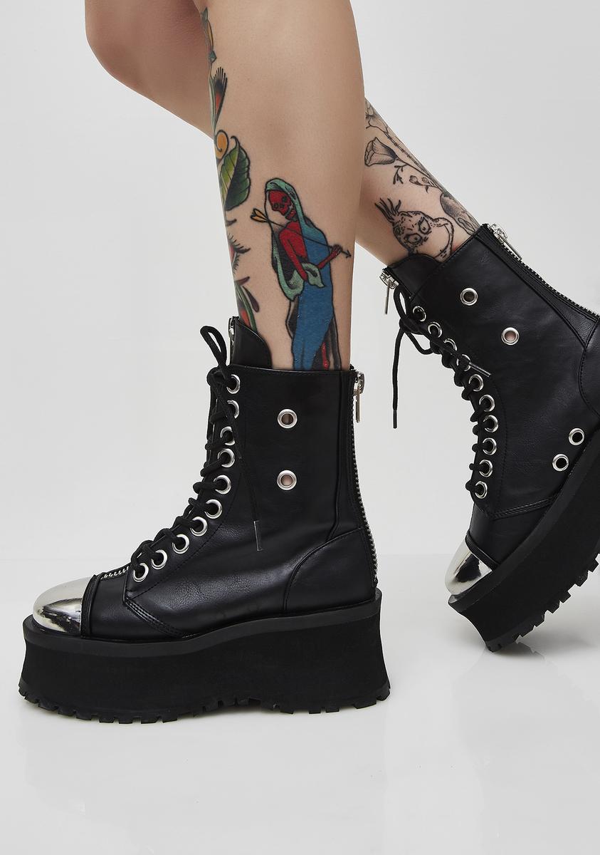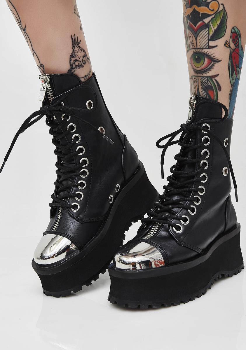 cuz rest in peace to all the memories. Don’t give a f*uck with this vegan leather combat boots that have silver metal cap toes, zipper N’ lace-up detail on the front and zip closures.