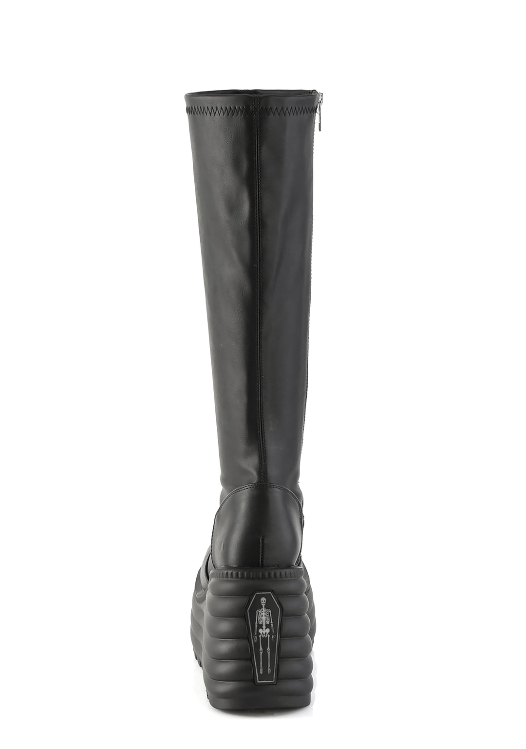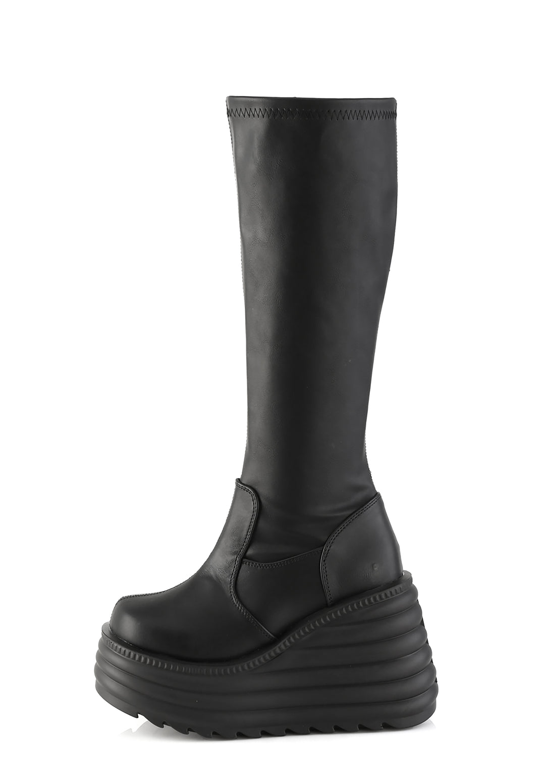 Demonia Morte-300 Platform Stretch Knee High Wedge Boots – Black