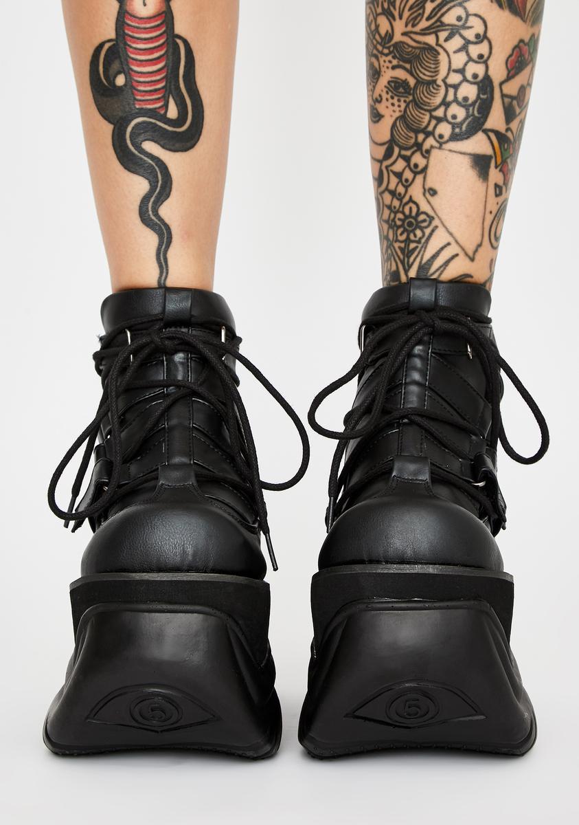 cuz you put ’em in a deadly trance! Stomp through cyberspace in these unisex chunky platform boots that have lace-up closures, adjustable velcro straps N’ a vegan leather construction.