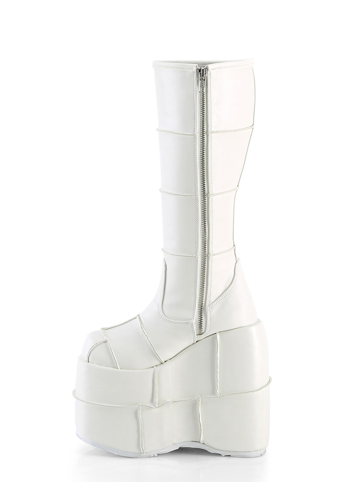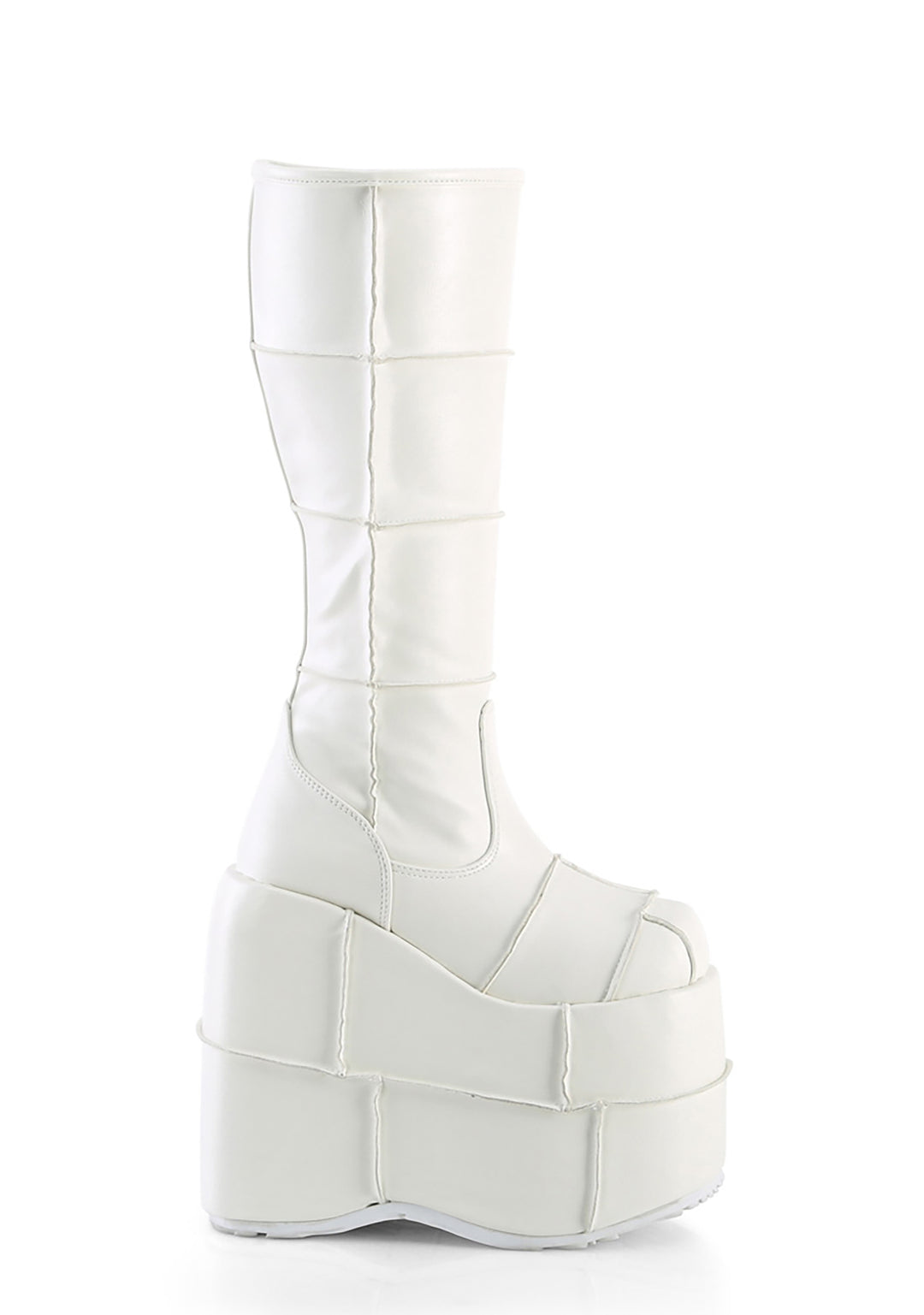cuz you’re an iced out club kid! These knee high boots have a vegan leather construction with a patched design, chunky platform soles, and side zip closures.