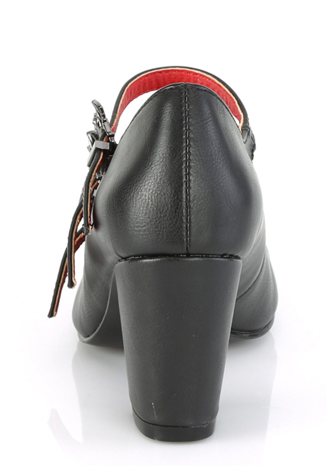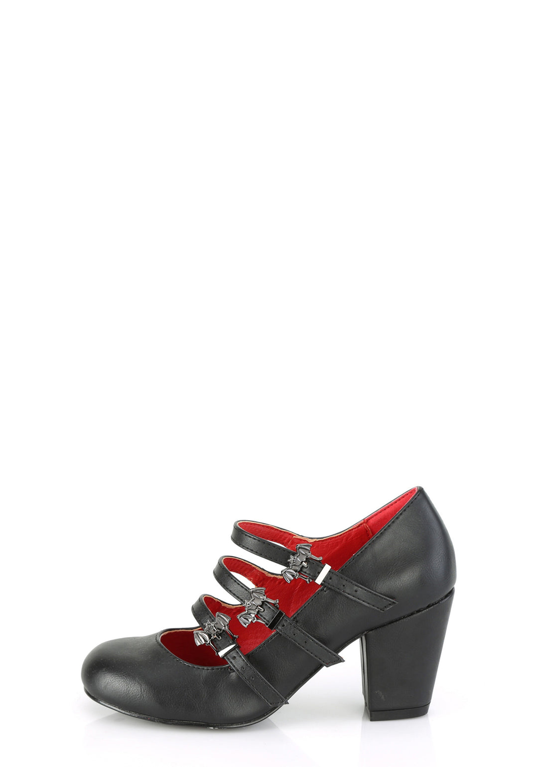 will bring forth the darkness within. These goth vegan leather Mary Jane heels have triple straps with bat-shaped buckles, rounded toes, and block heels.