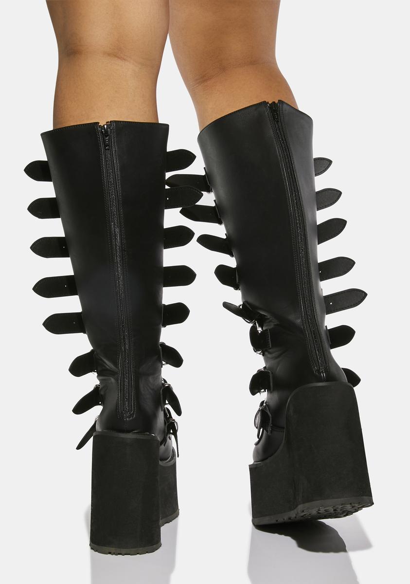 cuz the question is, red pill or blue pill? Enter the matrix in these badass knee high boots that have sky high platforms, tons of adjustable buckles with iconic metal plates, and back zip closures.